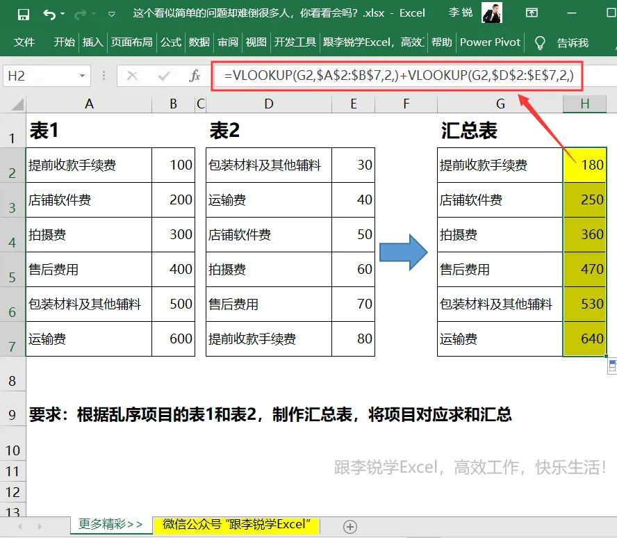 很多会用VLOOKUP函数的同学会分别从表1和表2查找项目对应费用再相加,公式如下:
