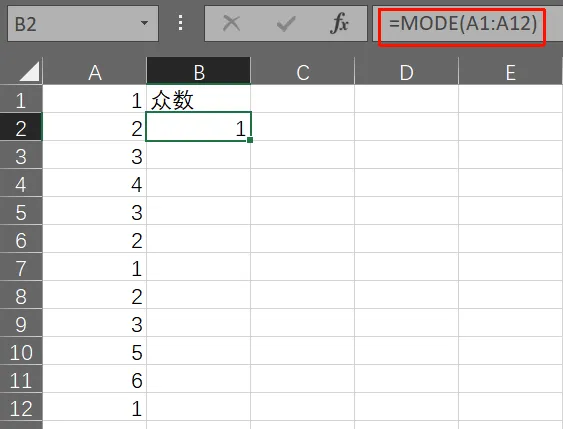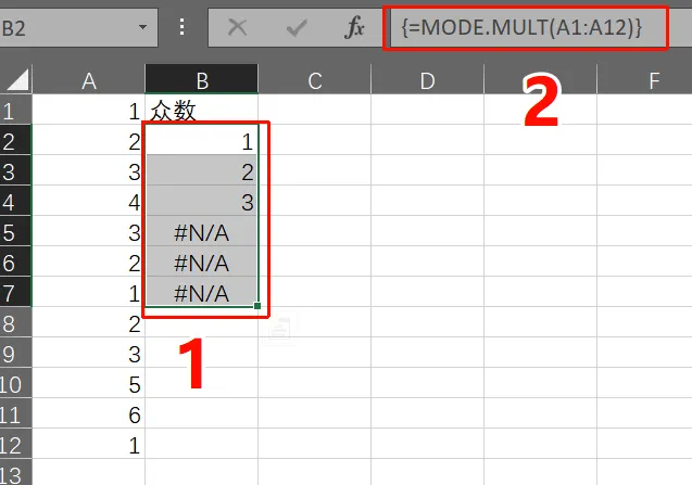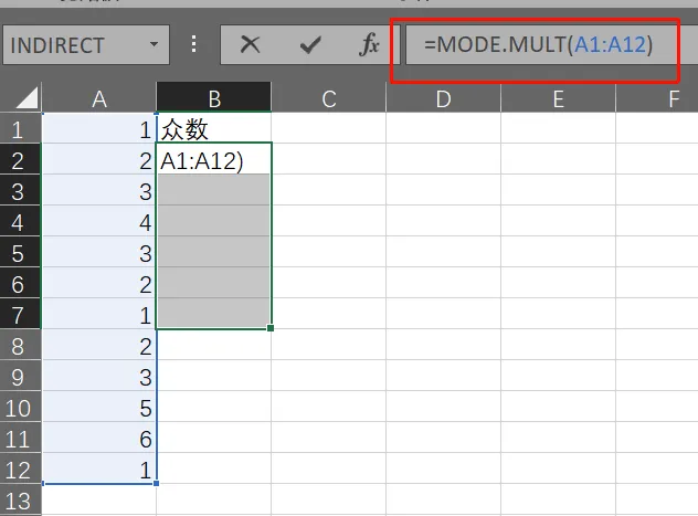 不难发现这个示例数据不止一个众数,这个函数没法返回。这个时候就需要用到MODE.MULT,这里只简单介绍使用方式,展开说太多了,具体的单独写一篇数组公式。