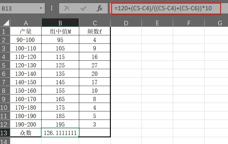 (1)确定众数组,由数据易知众数组为频数最高的组“120~130”,频数为27。(2)在单元格中输入公式“=120+(C5-C4)/((C5-C4)+(C5-C6))*10” 按Enter键即可。其中,120为众数组的下限,10 为众数组的组距,C5 为众数组的频数为f m ,C4为众数前一组的频数为f -1,C6为众数后一组的频数为f+1,计算结果如图所示。