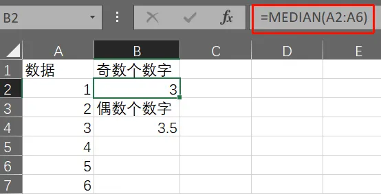 区域 A2:A6 中 5 个数字的中值。 因为有 5 个值,所以第三个是中值。