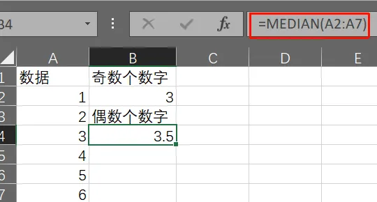 区域 A2:A7 中 6 个数字的中值。 因为有 6 个值,所以中值是第三个和第四个数字之间的中点。
