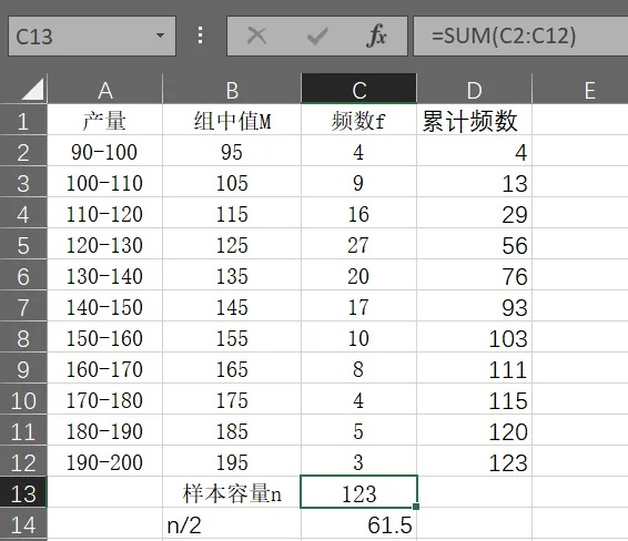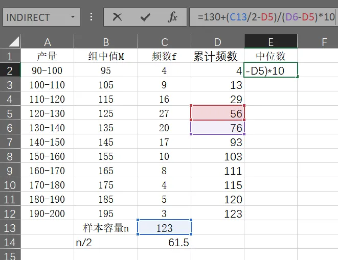 (4)根据公式来计算中位数,输入公式“=130+(C13/2-D5)/(D6-D5)*10”。其中,130为中位数所在组的下限,C13为样本个数n,D5为中位数所在组的前一组的累计频数,D6为中位数所在组的累计频数,10为组距。