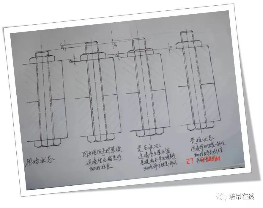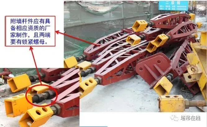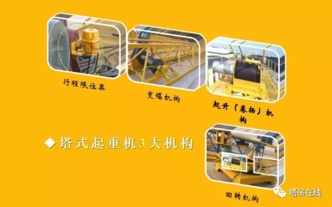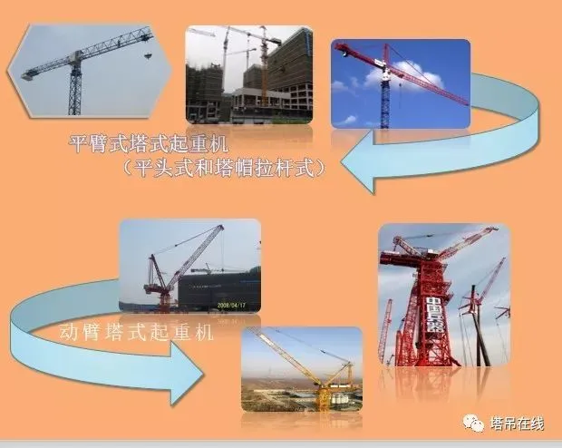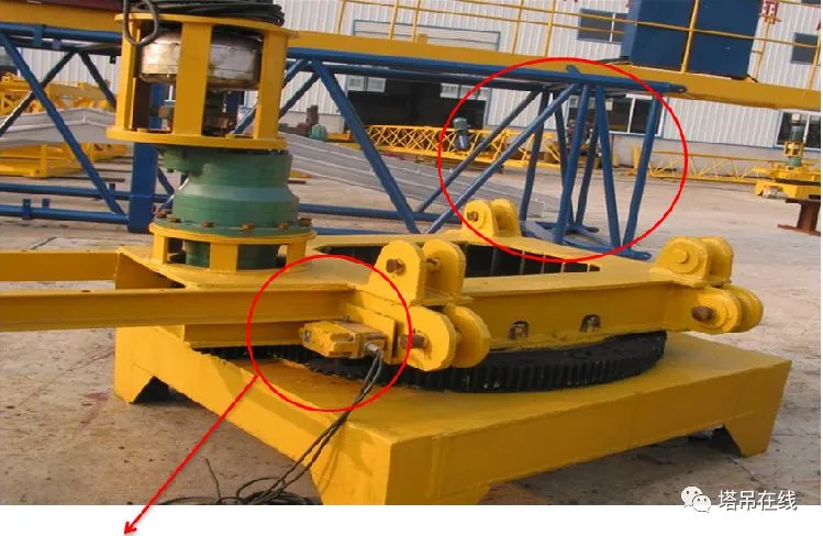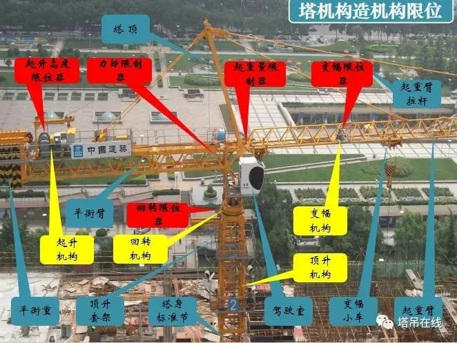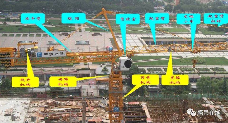 结构部位由基础节、标准节、外套架、上下回转总成、驾驶室、起重臂、平衡臂、塔帽,连接形式分为:销轴连接和螺栓连接两种形式。