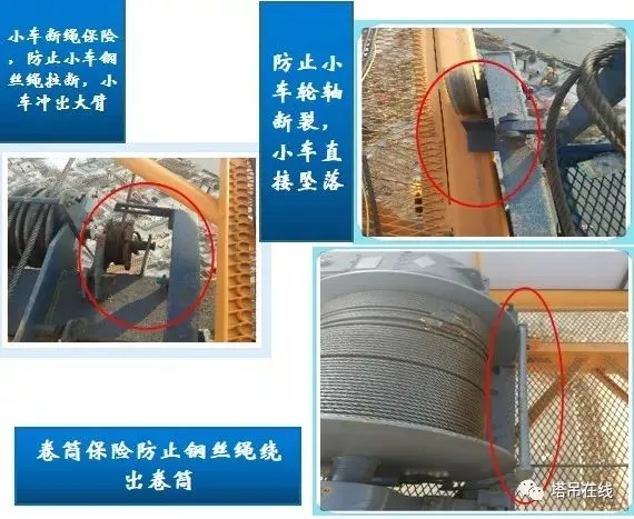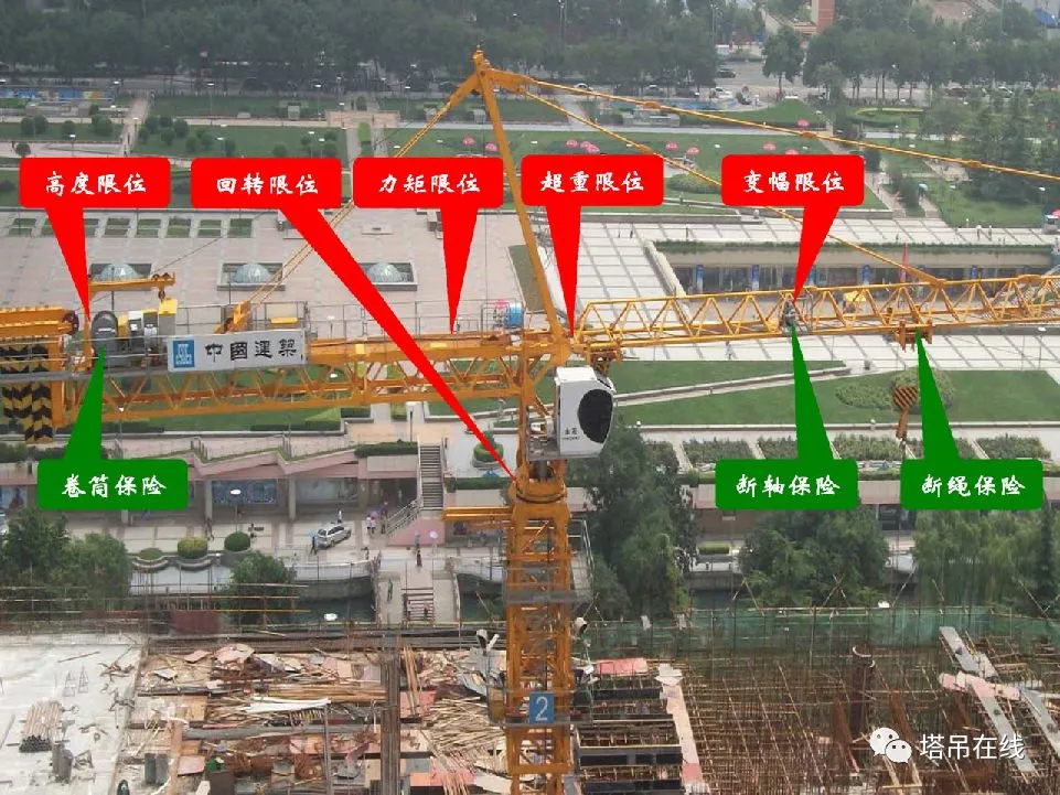 塔吊的安全保护装置分为五限位三保险即:起重量限制器,力矩限制器,高度限位器,变幅限位器,回转限位器,卷筒保险,小车断轴、绳保险,吊钩保险;塔吊的安全保护装置是保护安全运行的重要保护装置,如果一旦出现安全保护装置失灵或者损坏极易引发恶性事故的发生。