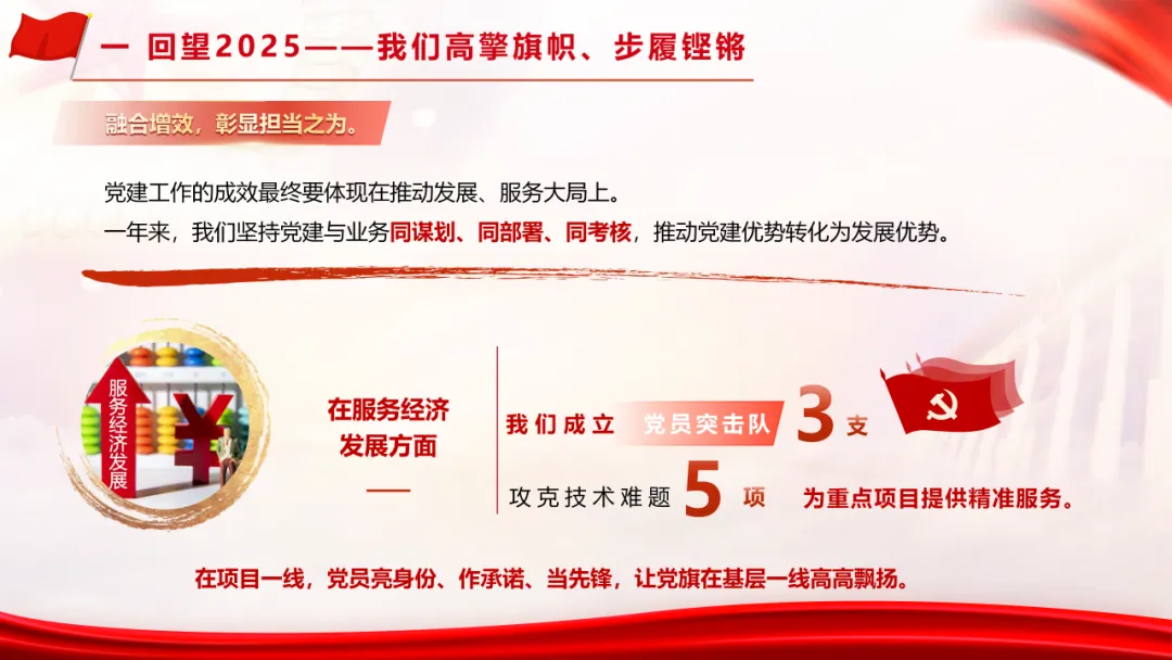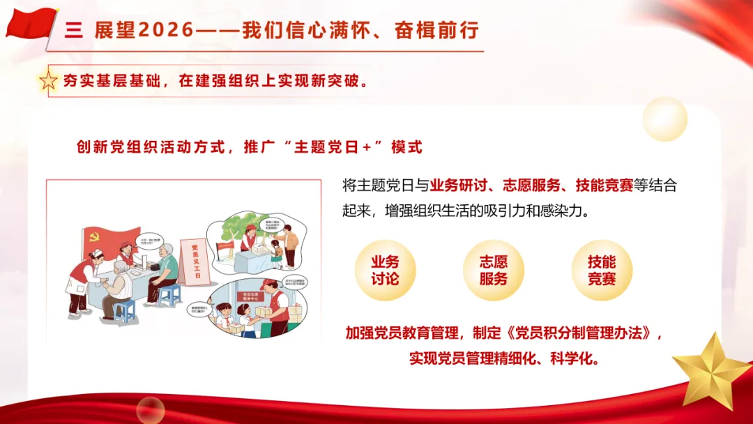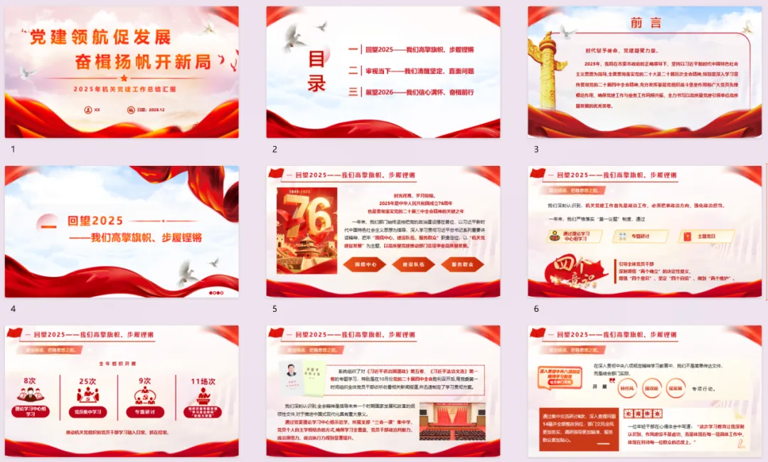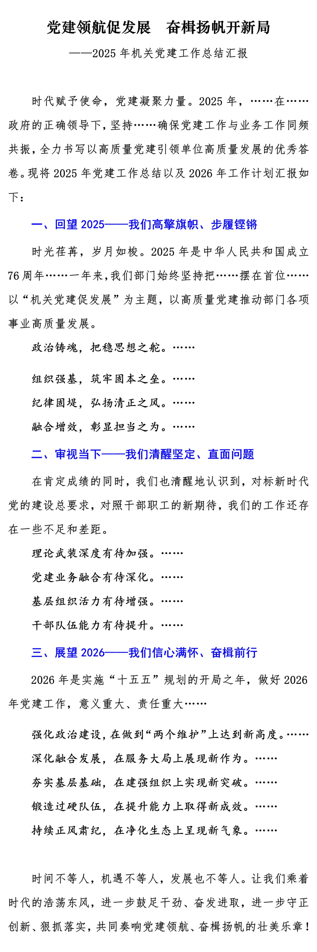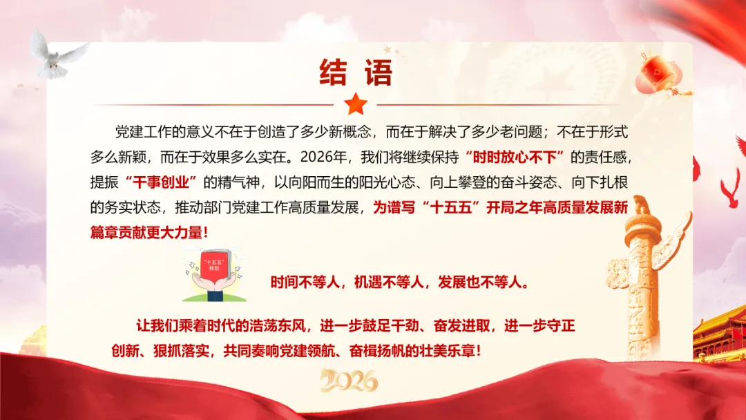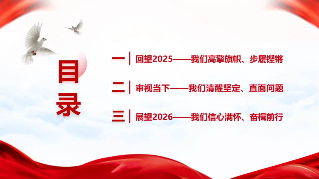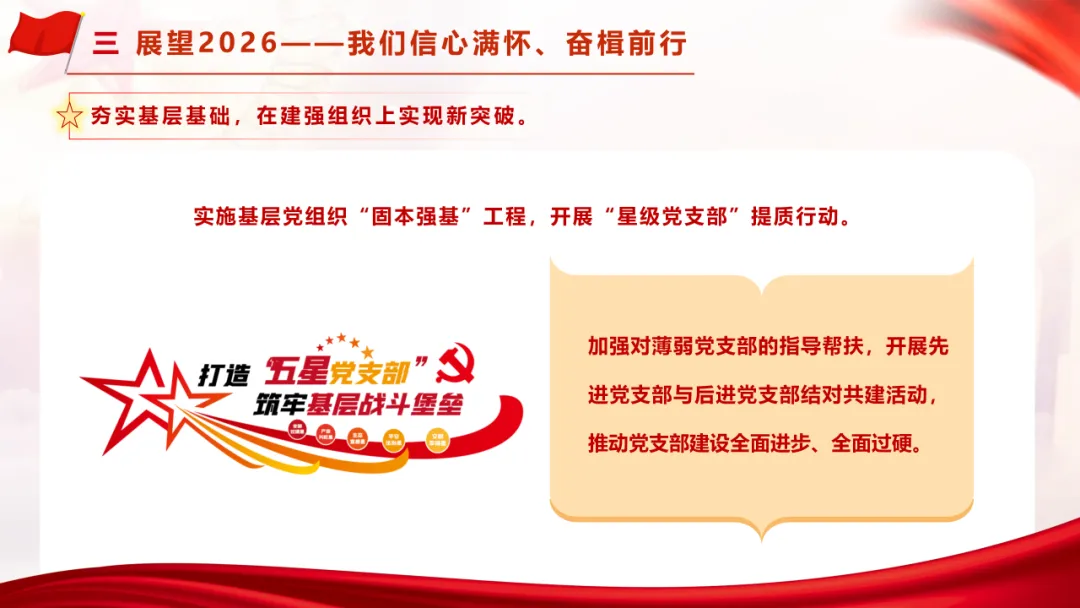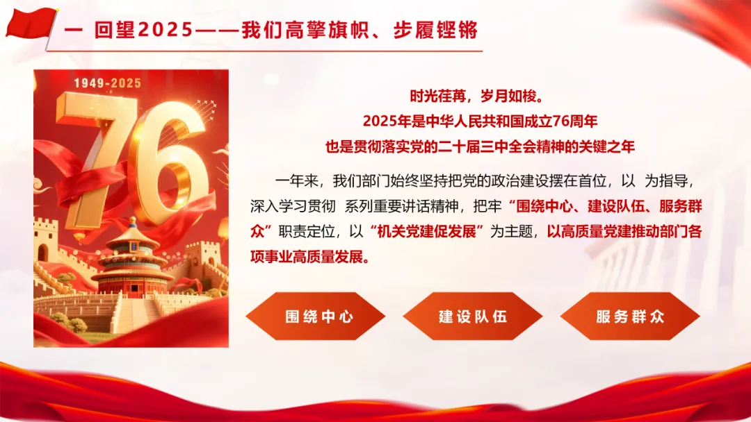 各位朋友 ,年度党建工作总结汇报是一项重要任务。我们刚刚完成的《党建领航促发展 奋楫扬帆开新局》PPT,对2025年度的党建工作进行了系统梳理,既有成果总结,也有问题分析,还对2026年的任务做了全面规划。