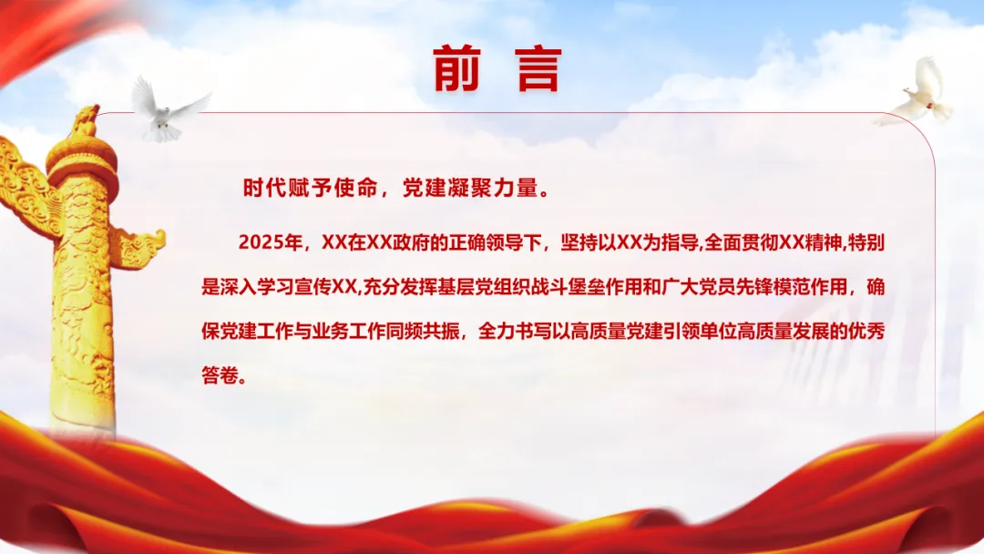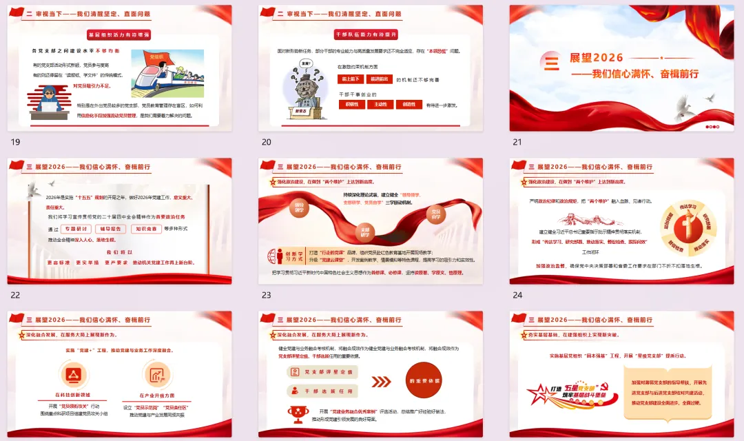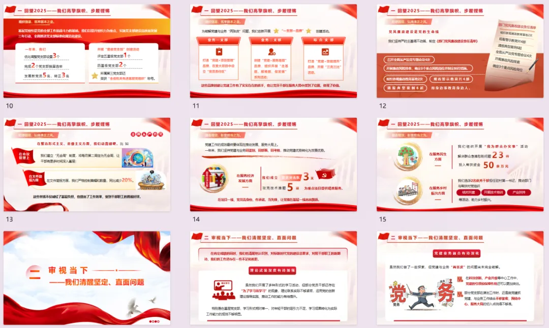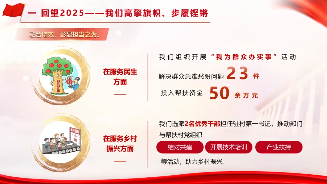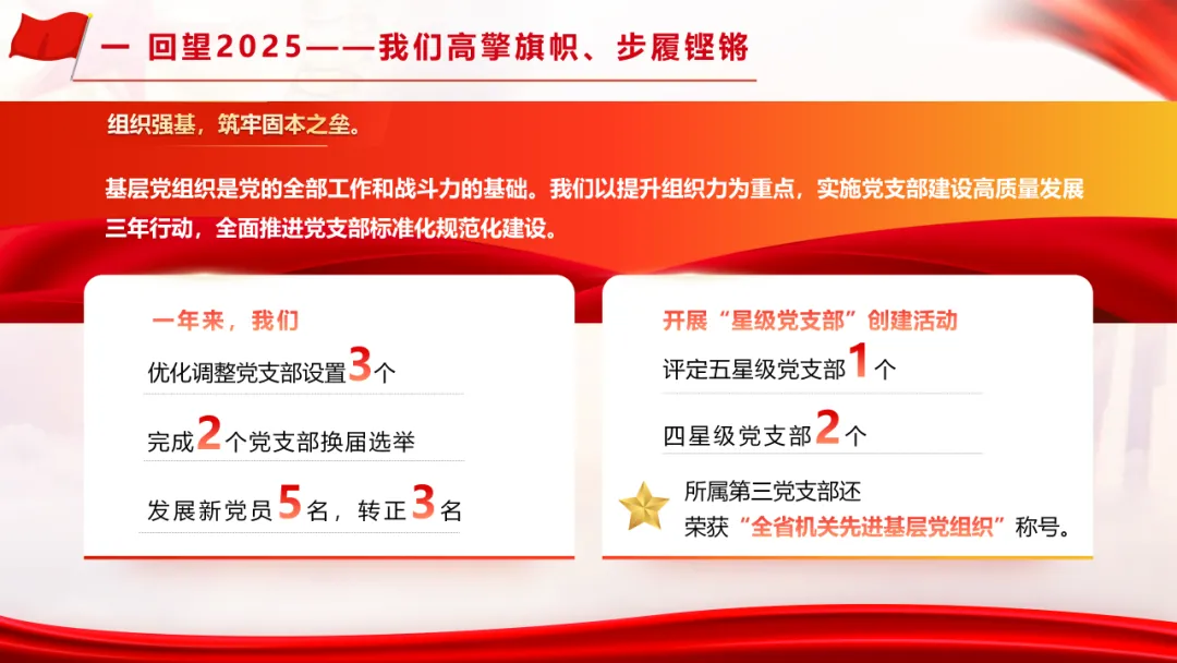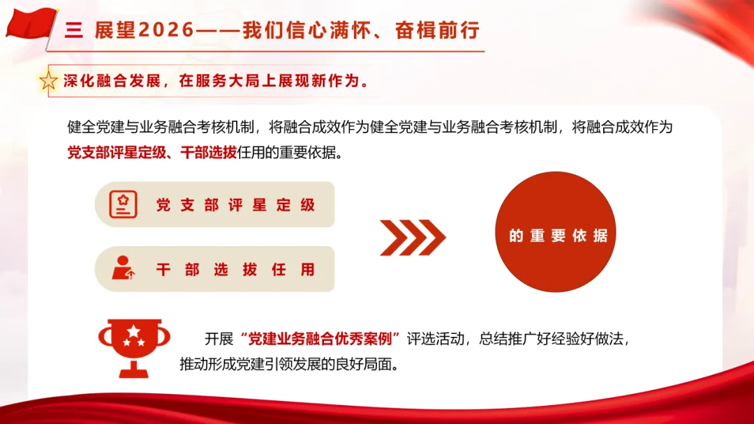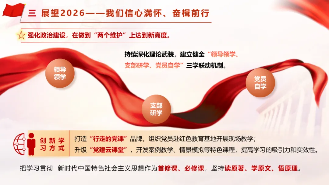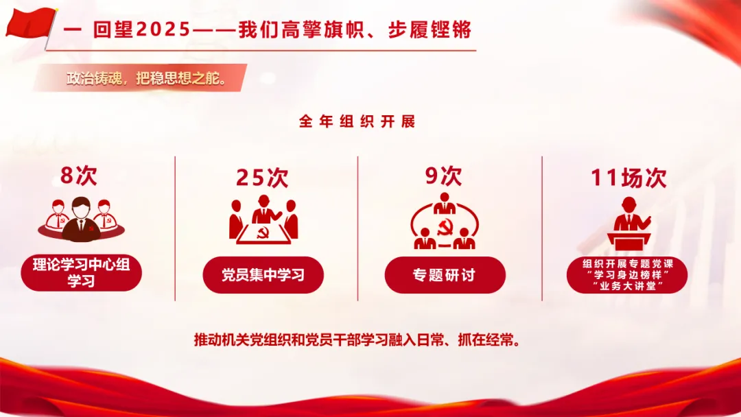 各位朋友 ,年度党建工作总结汇报是一项重要任务。我们刚刚完成的《党建领航促发展 奋楫扬帆开新局》PPT,对2025年度的党建工作进行了系统梳理,既有成果总结,也有问题分析,还对2026年的任务做了全面规划。