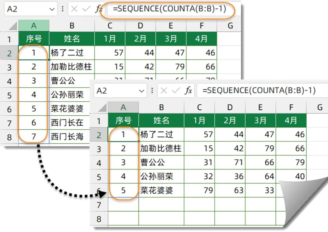 小伙伴们好啊,今天和大家分享几个常用Excel公式,点滴积累,也能提高效率。如下图,在A2单元格输入以下公式,可以生成随着数据增加而变化的序号。COUNTA(B:B)-1部分,计算B列非空单元格的个数。减去1,得到不包含标题行在内的实际记录数。SEQUENCE函数用于生成指定行列的序列号。本例中,生成序号的行数由COUNTA(B:B)-1的结果来指定。也就是B列有多少行数据,SEQUENCE函数就生成对应行数的序号。2、自定义排序