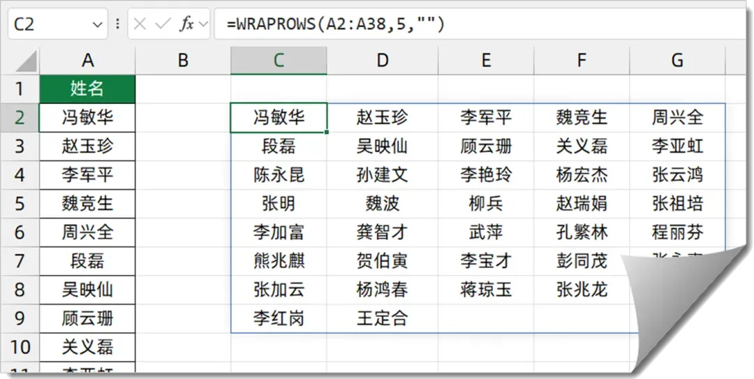 如下图,希望将A列的姓名转换为5列。C2单元格输入以下公式即可: