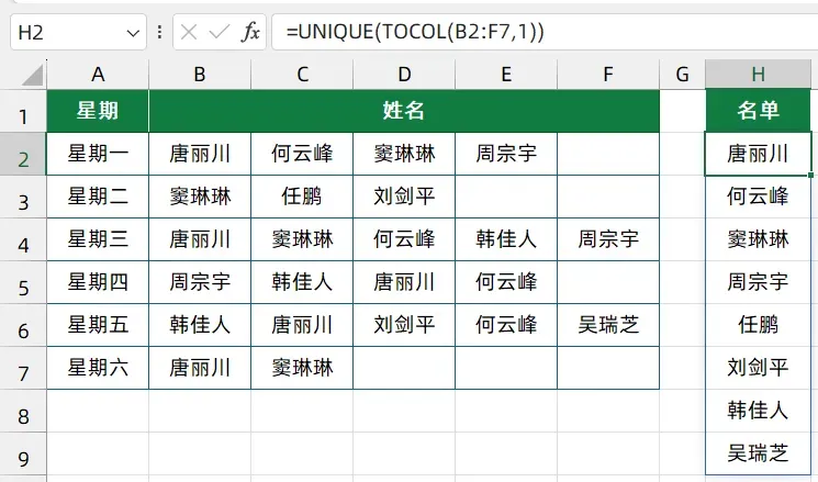 首先使用TOCOL函数将B2:F7中的姓名转换为一列,TOCOL函数的第二参数使用1,表示忽略空白单元格。