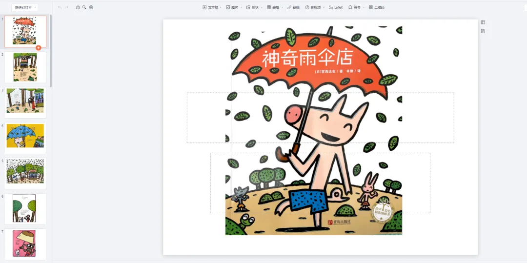 绘本阅读是幼儿教育的重要方式,但许多家长因孩子不识字或价格高而忽视其价值。实际上,绘本通过图文结合能同时刺激儿童的视觉和语言发展。优质绘本能提升儿童的认知、语言和社交能力。长期阅读对学业发展和亲子关系都有积极影响。绘本既是学习工具,也是亲子互动的桥梁。绘本PPT通过丰富多彩的故事和生动的画面,激发幼儿园儿童的学习兴趣,培养他们的阅读能力、想象力和创造力。 绘本PPT电子版画册涵盖了各种主题和风格,包括寓言故事、科普知识、生活常识、人际交往等方面,满足不同年龄段儿童的阅读需求。这些绘本不仅具有丰富的故事情节和精美的插图,还注重文字表达简洁易懂,适合幼儿园儿童阅读和理解。《神奇雨伞店》里的这只小猪在树林里遇到了一家神奇的雨伞店。那些雨伞上面印着什么图案,打开来,天空就会降落下什么东西。遇到小兔子,小猪打开了画满寿司的伞;遇到大野狼时,小猪打开了一把黑黑的、神秘的伞,这把伞,到底有什么神奇之处呢?