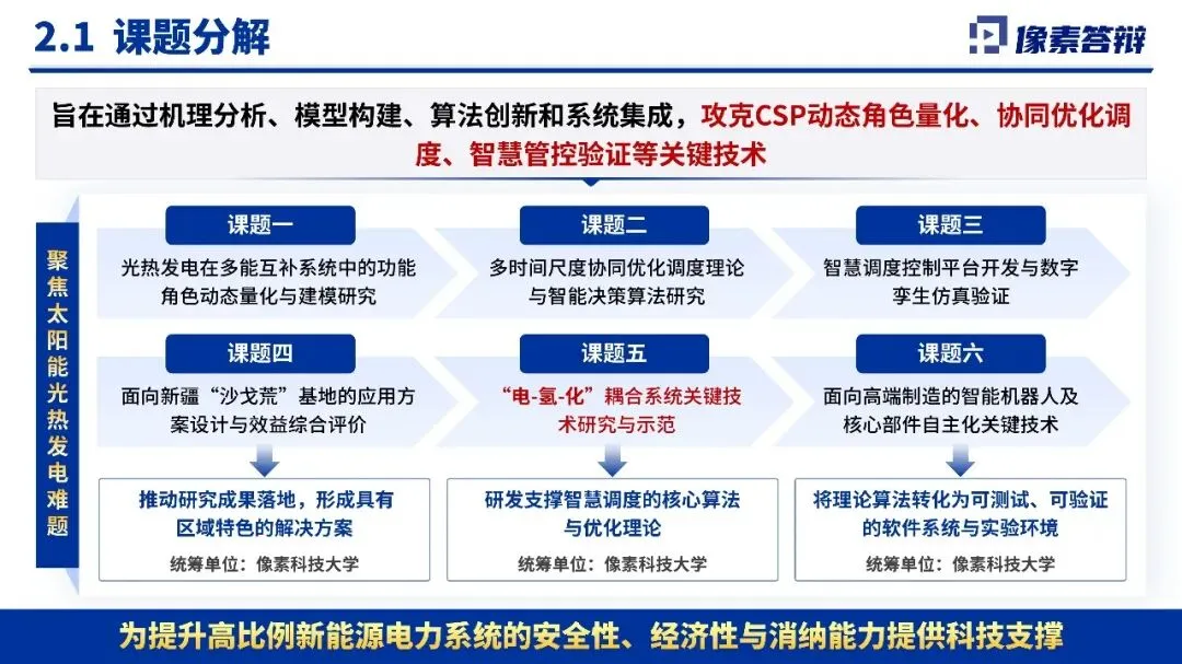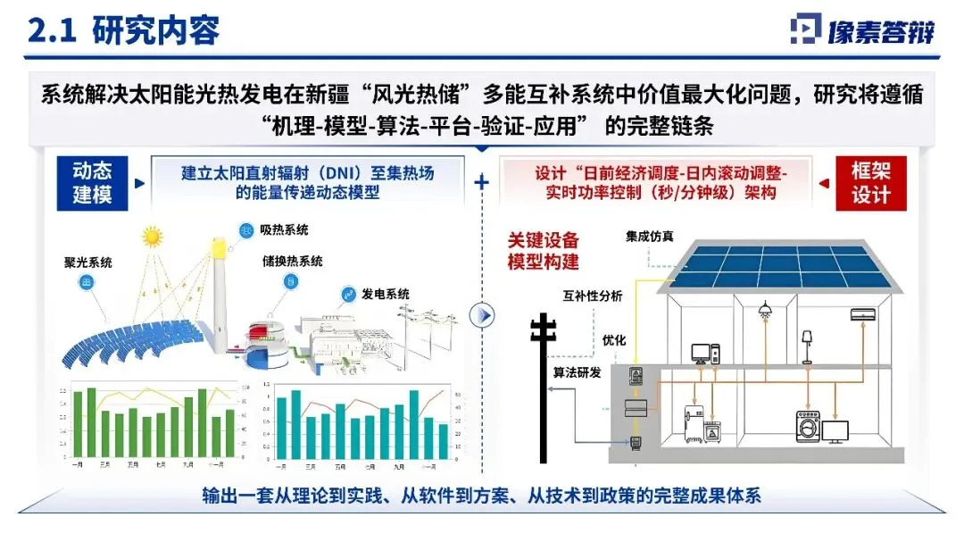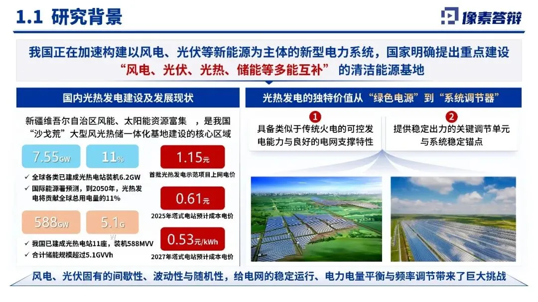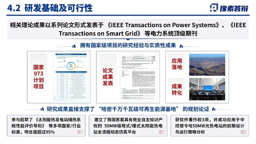 该PPT系统阐述了太阳能光热发电在新疆多能互补系统中的关键作用与调度优化研究项目,旨在申报新疆重大科技计划。研究聚焦构建光热发电动态模型、多时间尺度调度算法与智慧管控平台,致力于解决高比例新能源并网的稳定与消纳难题,为新疆“沙戈荒”清洁能源基地提供可落地的技术方案与调度支撑。该项目聚焦太阳能光热发电在新疆多能互补系统中的关键作用与调度优化研究,申报新疆重大科技计划。研究旨在解决高比例可再生能源并网带来的稳定性与消纳难题,通过构建光热发电动态模型、开发多时间尺度调度算法与智慧管控平台,形成具有区域特色的“新疆方案”,支撑“沙戈荒”清洁能源基地建设,助力新型电力系统转型。PPT以“需求分析-课题分解-技术路径-成果预期”为主线,系统阐述了项目的战略意义与技术框架。内容紧扣新疆能源禀赋与系统痛点,从光热动态建模、多时间尺度调度算法到数字孪生验证平台,形成完整研究链条。数据支撑充分(如光热成本下降趋势),课题设置覆盖机理、算法、平台与应用四层次,但部分图表可进一步优化逻辑呈现,技术细节深度可加强。项目优势在于紧密贴合国家能源战略与区域发展需求,研究体系完整、产学研结合紧密,团队具备扎实的前期基础与成果积累。预期成果兼具理论创新与应用价值,突出“可落地、可推广”。不足之处在于风险分析较为薄弱,对技术跨领域整合的挑战、产业化推广障碍可进一步阐述,部分内容表述稍显宏观。建议在答辩中进一步突出光热发电相较于其他灵活性资源的独特优势与不可替代性;强化各课题之间的协同机制与阶段性里程碑;明确技术成果的量化指标与验证路径。同时可补充更多新疆本地实证案例与合作网络介绍。整体而言,项目现实意义突出、技术路线可行,具备较强的立项必要性与实施潜力。整套PPT共计 18 页,源文件均可编辑和修改PPT制作相关服务,请后台留言,或者扫码联系我们,微信:XSDB1017