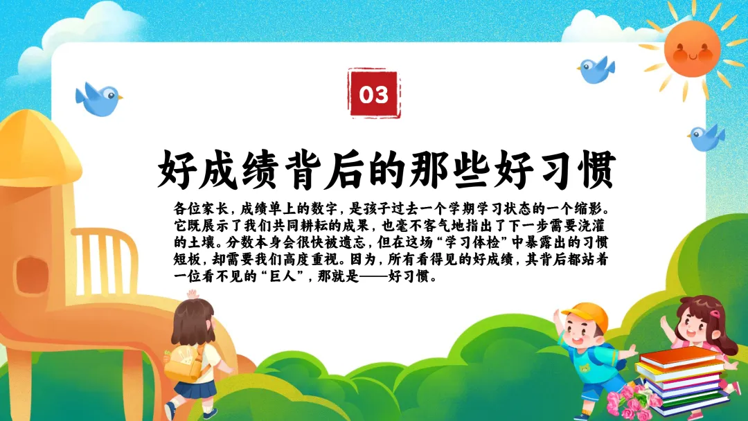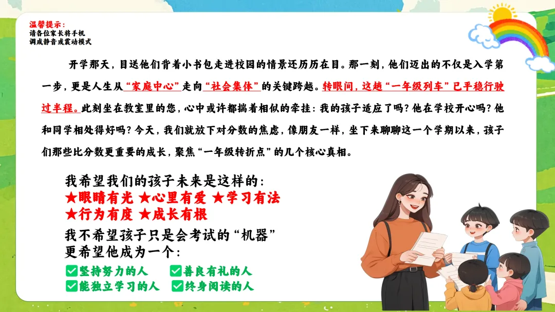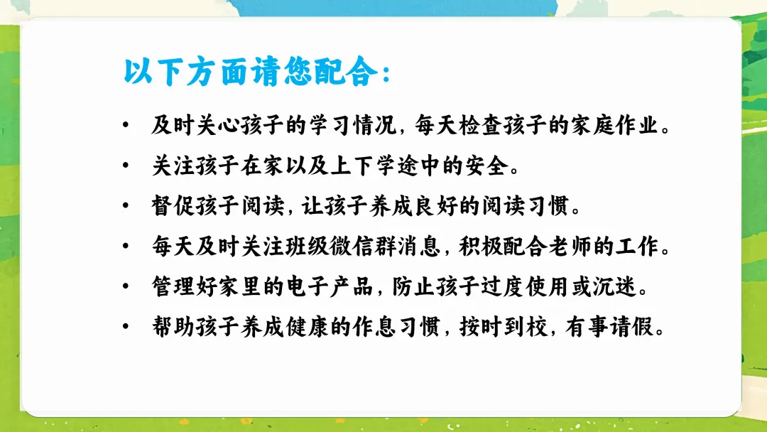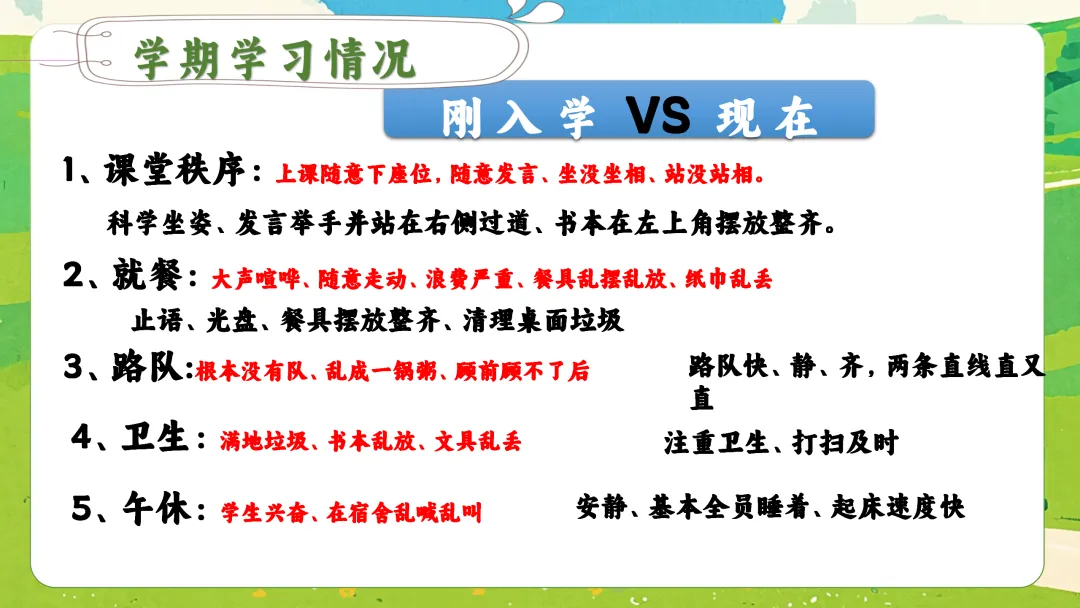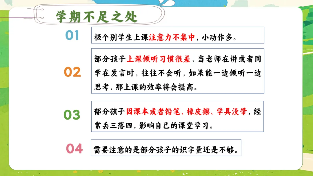 当然,成长中也暴露了一些需要我们家校合力引导的问题:比如,部分孩子整理能力弱,书包、文具凌乱;课间仍有追逐打闹的安全隐患;极个别孩子存在说脏话、带零食玩具到校影响学习的情况。这些问题,正是我们下半学期要重点帮助孩子改进的地方。