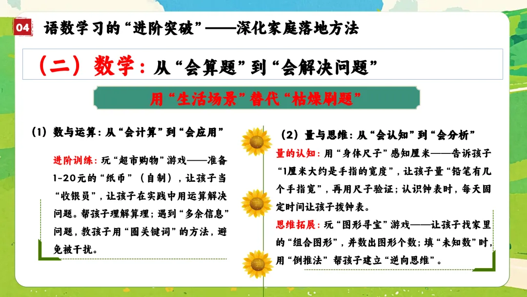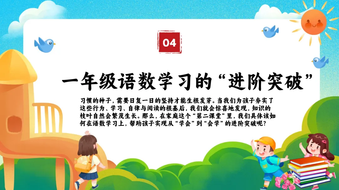 习惯的种子,需要日复一日的坚持才能生根发芽。当我们为孩子夯实了这些行为、学习、自律与阅读的根基后,我们就会惊喜地发现,知识的枝叶自然会繁茂生长。那么,在家四、一年级语数学习的“进阶突破”——从“学会了”到“学活了”