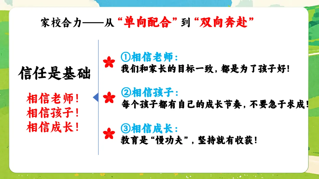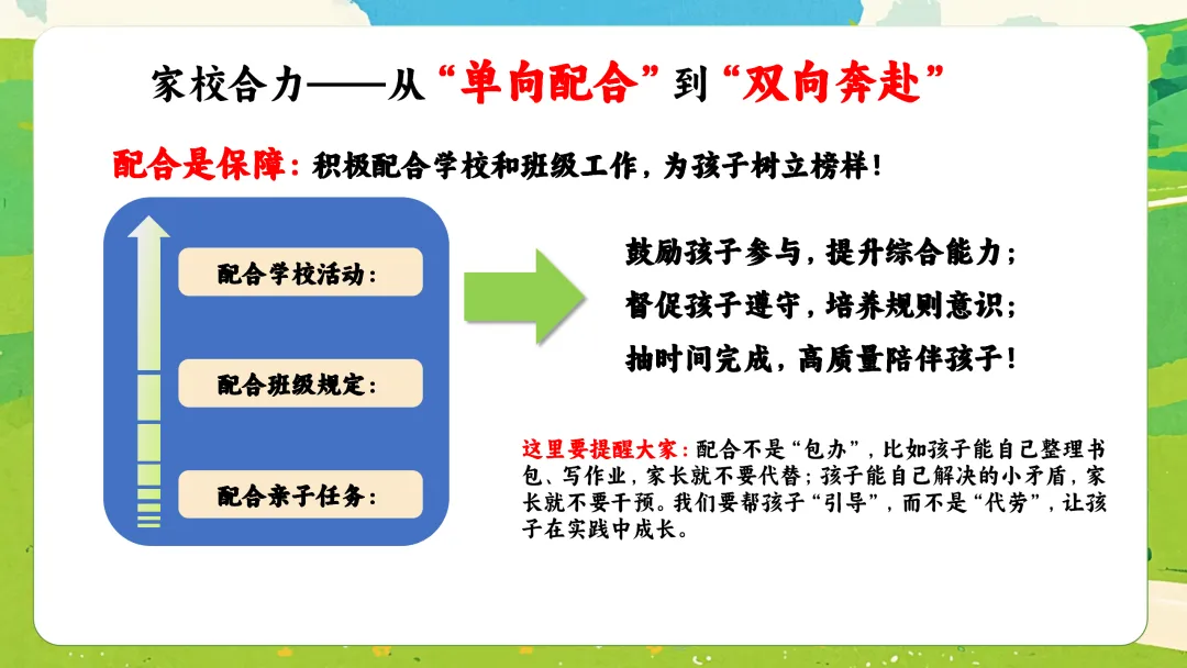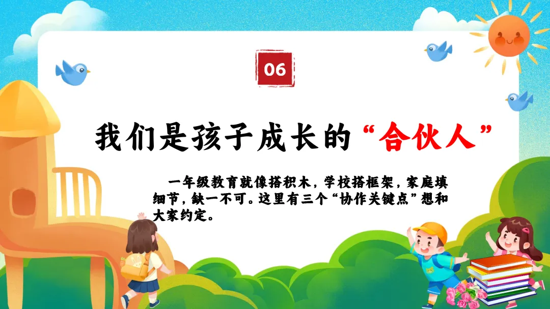一年级的教育就像共同搭建一座积木城堡:学校负责搭建稳定的主体框架和传授通用的方法,而家庭则负责填充丰富的细节、色彩和赋予它独特的气质。二者缺一不可。在此,我想和各位家长达成三个“协作关键点”的约定: