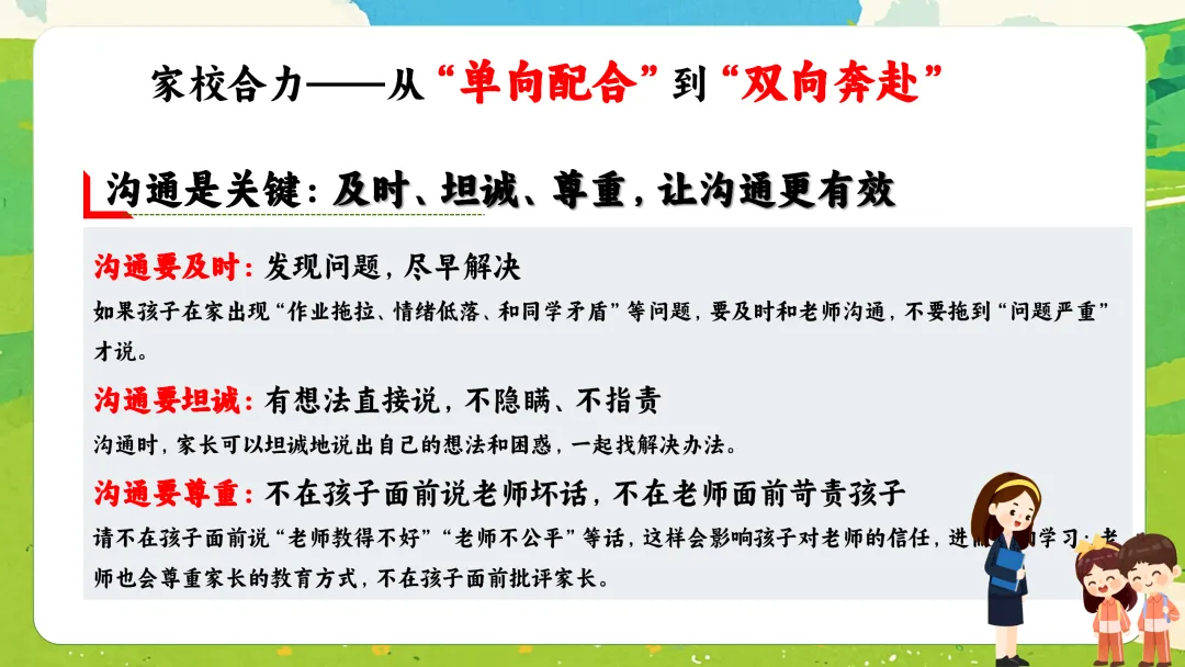 我们要做的是在旁支撑、引导,而不是替孩子承受所有压力、完成所有任务。沟通时,请多分享孩子的性格特点、身体状况,但请避免过度干预孩子在学校的正常交往和问题解决。偷偷帮孩子改作业、替孩子去道歉,看似是爱,实则是剥夺了他学习面对问题、完整版可编辑电子资料 获取方式: