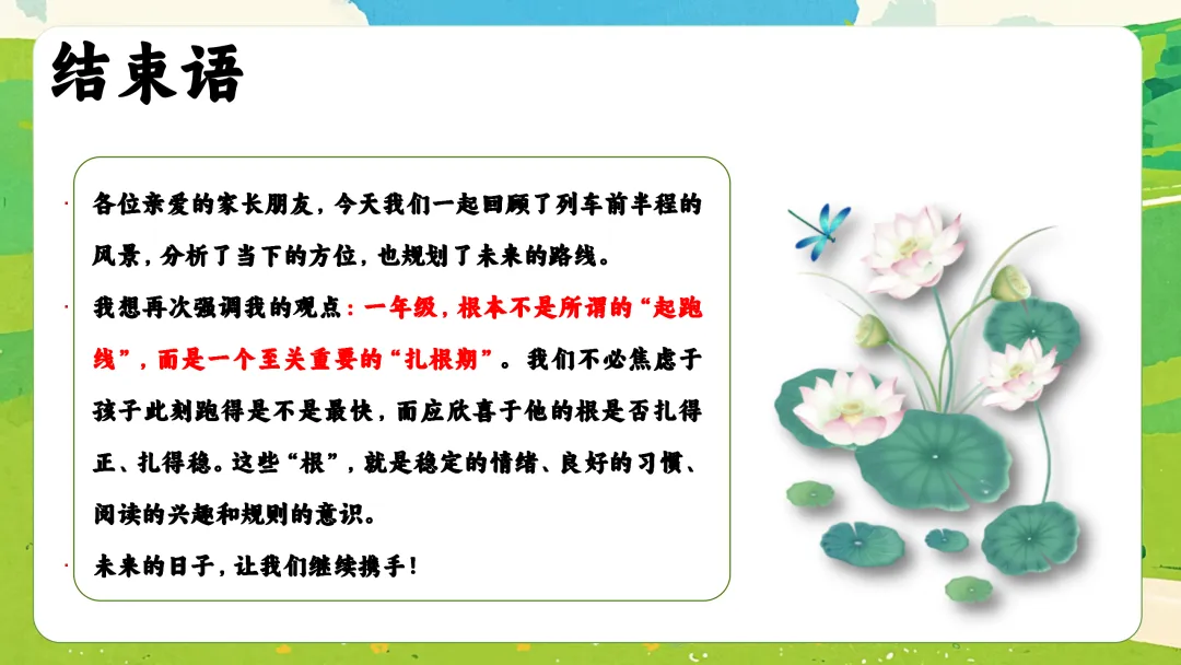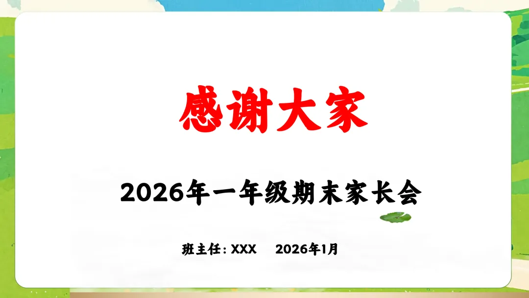 很高兴在这与您相遇,如果您是一位班主任老师,每天除了应对繁重的教学工作,还要加班整理班级、教务、教研、课件PPT资料,请关注下方的“春雨教务资料”,让我们风雨同路、一起成长~今天分享的是一年级上期末家长会的ppt课件和发言稿,主题是《初绽光芒,未来可期》。