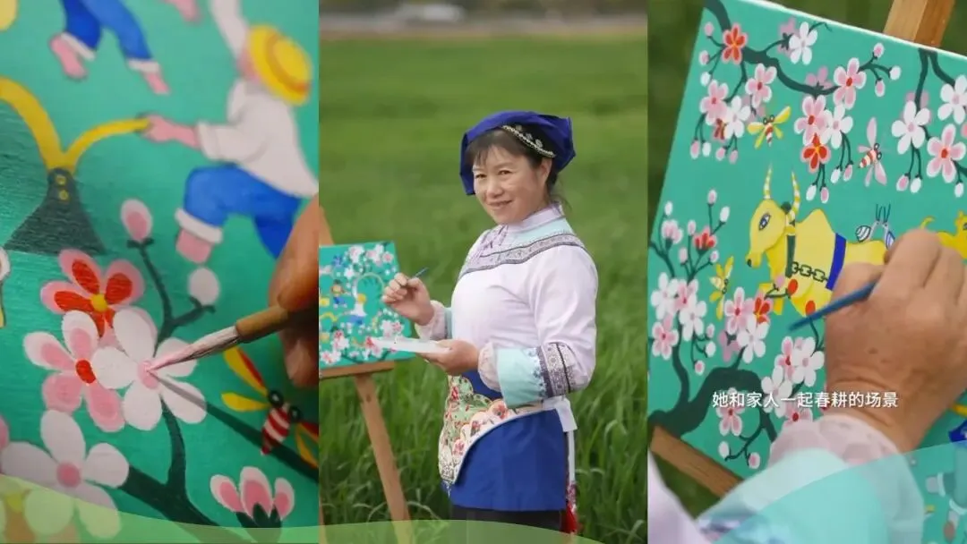 它源自这些在云南田间劳作的劳动人民们,他们每天在田间头埂里去耕作,然后用闲暇的时间,用他的画笔画下他觉得非常有意思的场景,有像这一幅,就是这位画师他和家人一起春耕的场景,每一幅画它都有个不一样的视角。
