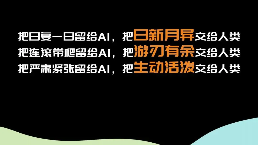 我们要把日复一日留给AI,把什么留给我们?日新月异留给人们,我要把连滚带爬留给AI,把游刃有余留给人类,我们要把严肃紧张留给AI,把生动活泼留给人类。