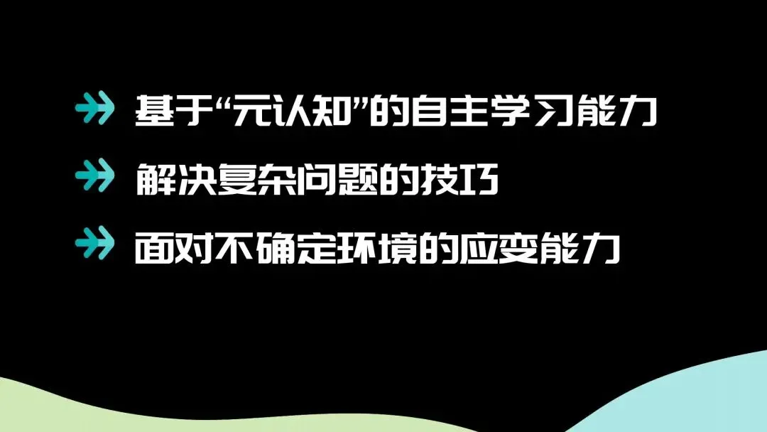 首先第一个就是基于“元认知”的自主学习能力。我们说元认知就是最基础的认知,那么在这里,如果我们孩子没有自主学习能力的话,面对不确定的问题怎么去解决?我们的老师未来已经不是答案的提供者,他是我们的学习伙伴,所以我们的孩子如果不会学习,只会被动的学习,被灌输知识的话,也就说我们只会被投喂,那当我遇到新问题的时候怎么去学习呢?不可能,他就会慌,他就会张。