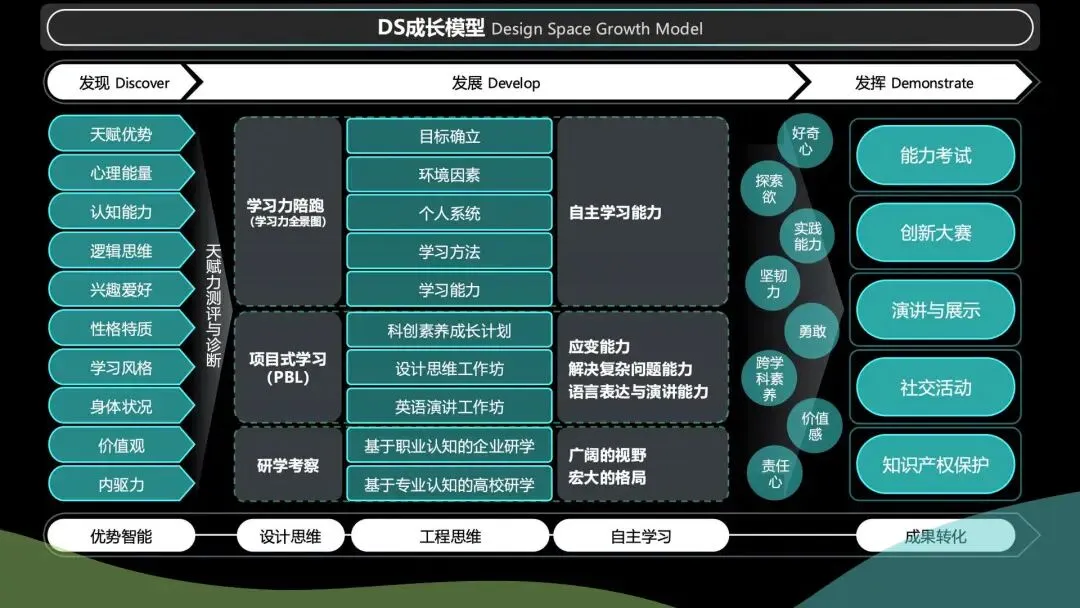 这个就是我们经过这一年的时间实践研究总结出来的,也是我今天第一次向世人发布的 DS 成长模型(也是我们的成长配方):在这个配方里我们有寻找孩子的天赋,在天赋当中找到他的优势智能,然后再匹配我们每一个创新的项目,让它蓬勃发展,不断的试错,反复的迭代,去历练,培养这些核心的能量,最终借助国家的顶尖的、权威的平台,让它绽放,让它发展。所以每一步我们都希望孩子们能够遵循它走,当然这套模式我相信还有很多值得我们修正的地方。但是我们希望这个就是我们的 1.0 版,我们会不断地运用设计思维,让这个2.0、3.0、 4.0 不断地往前推。