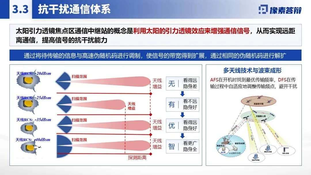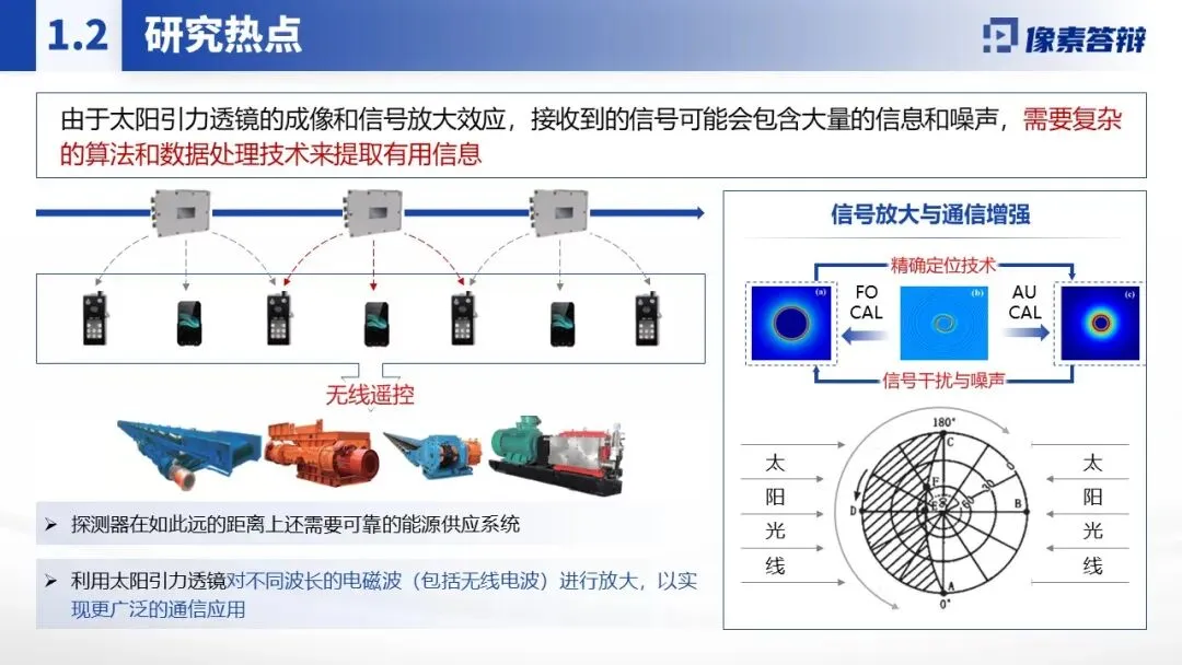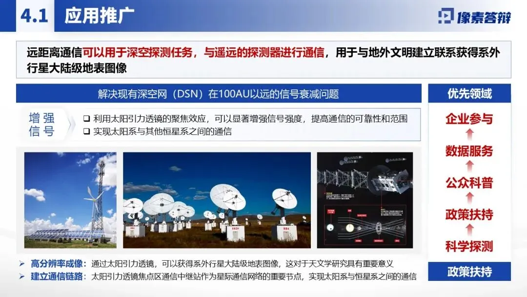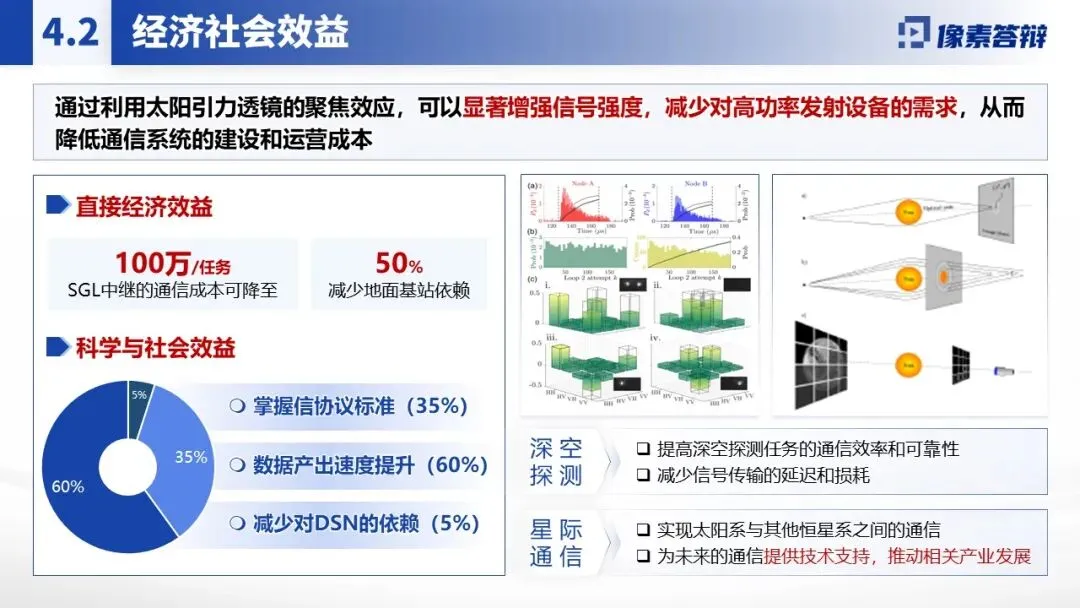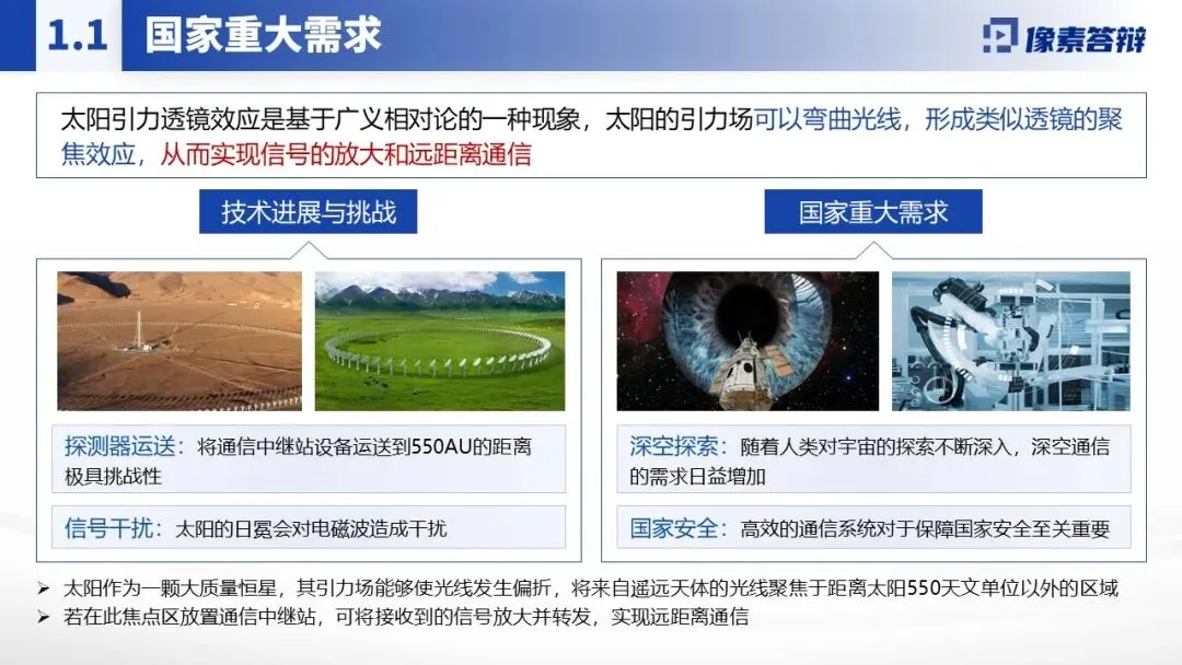 采用蓝色科技风主调,贴合航天、引力物理主题,风格简洁严谨。大量运用示意图(太阳引力透镜聚焦原理、卫星轨道架构)、数据图表(信号强度对比、轨道控制精度曲线)、场景图(深空通信链路、探测器部署)替代大段文字,将 “引力透镜效应”“动态轨道 AI 控制” 等复杂概念直观化。核心数据(如通信延迟、信噪比提升幅度)用加粗或色块突出,关键技术流程(如抗干扰通信体系构建)以流程图展示。穿插国际学术评价、技术原理示意图等佐证材料,增强成果可信度与前沿性。