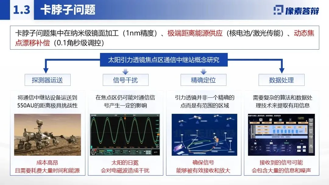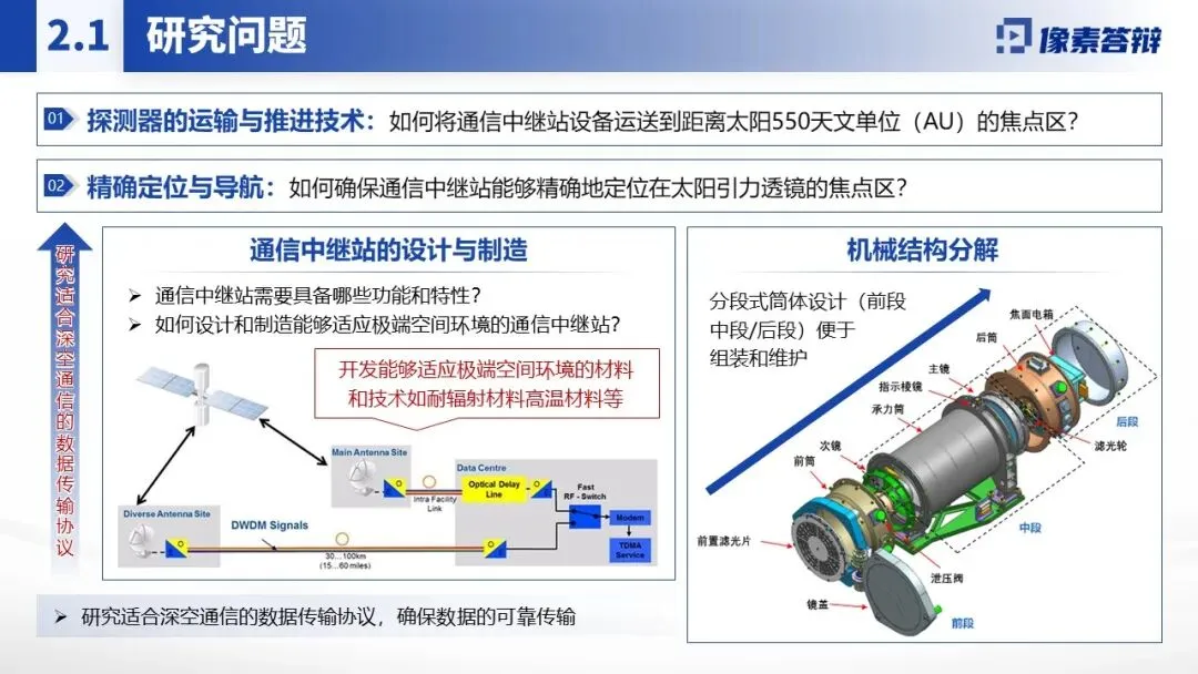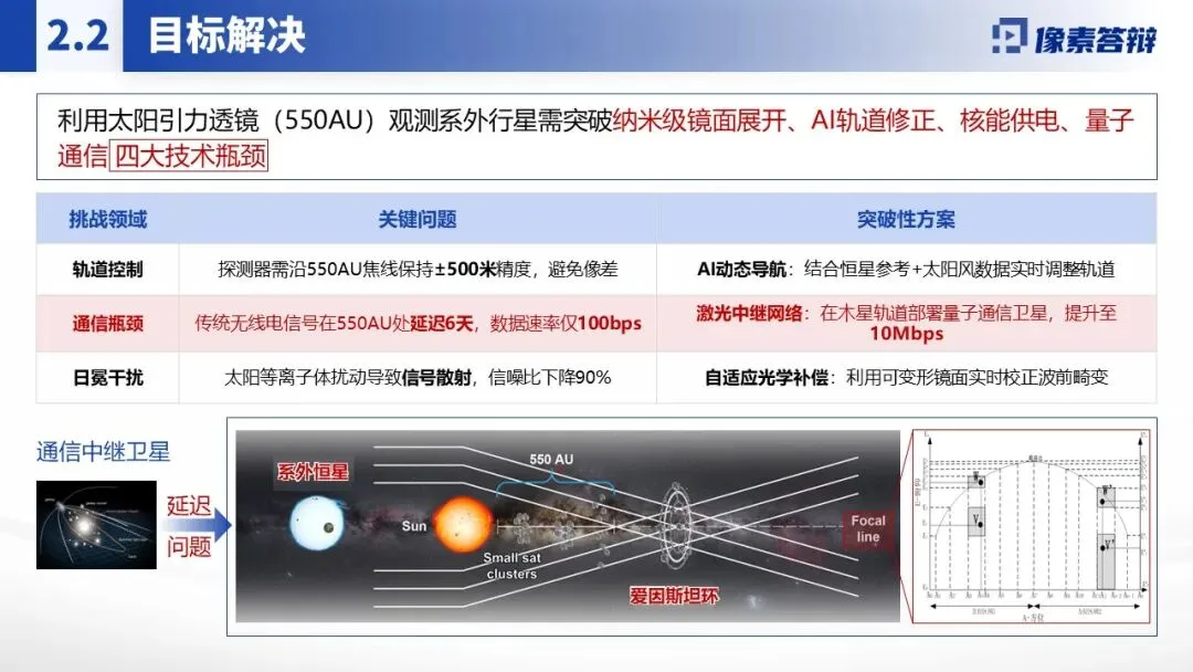 紧扣深空探测、国家安全等重大战略需求,聚焦太阳引力透镜通信这一前沿领域,精准定位 “探测器运输、信号干扰、精确定位、数据处理” 四大核心瓶颈。内容围绕 “基础原理 - 技术攻关 - 应用价值” 展开,突出 “超高分辨率成像、动态轨道 AI 控制、抗干扰通信体系” 三大原创突破,配套具体技术方案(如 AI 动态导航、激光中继网络)与量化指标(如信号速率提升至 10Mbps、轨道精度 ±500 米),彰显项目在航天通信领域的颠覆性价值。