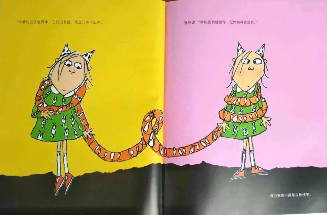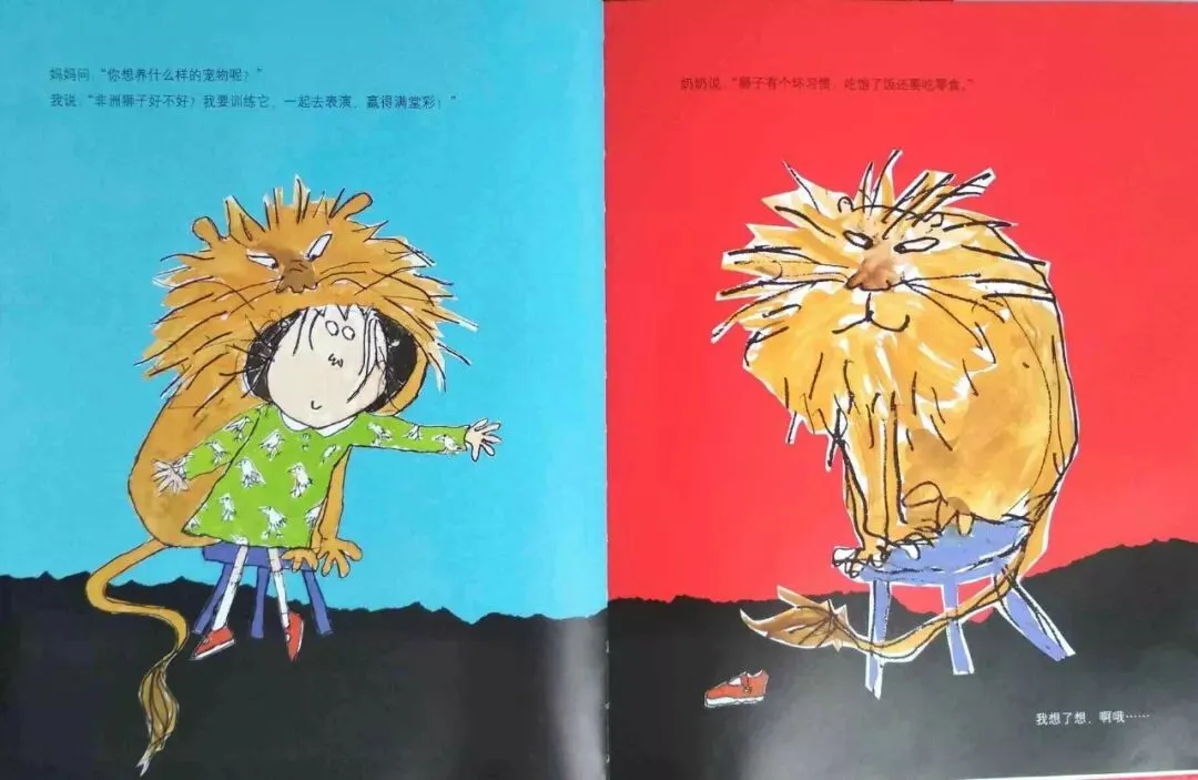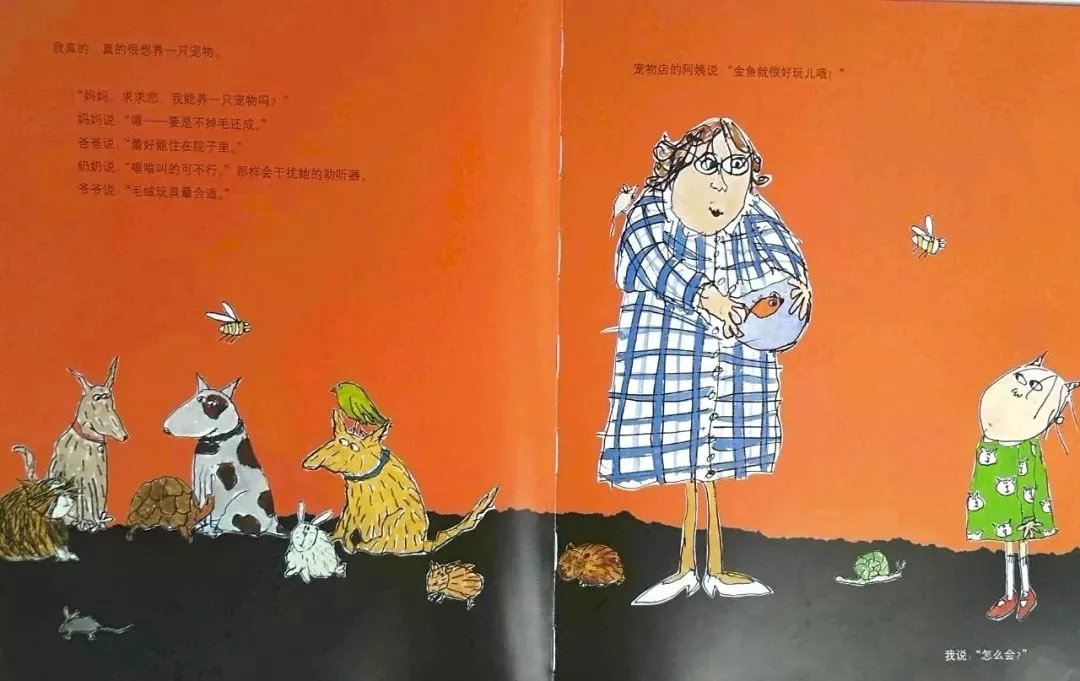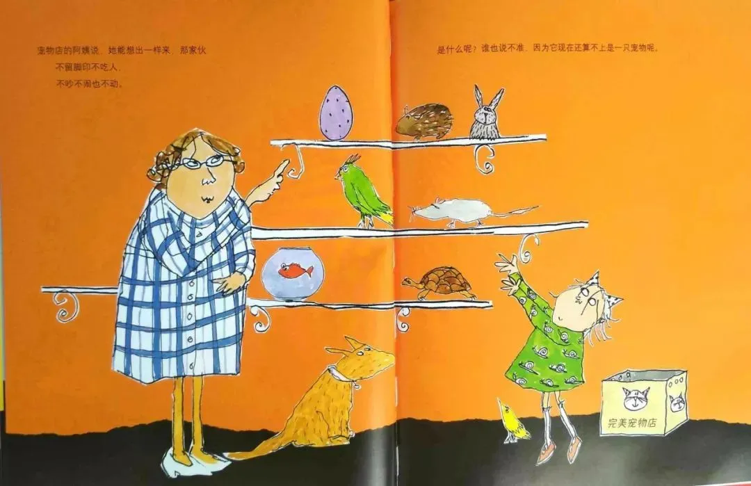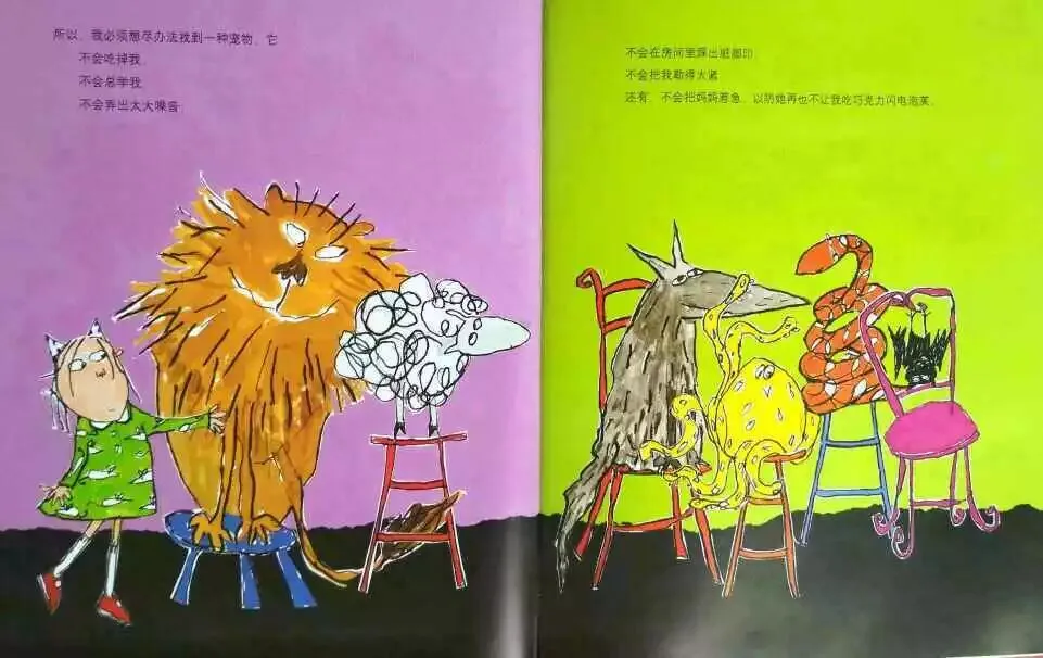 奶奶说:“嗡嗡叫的可不行。”那样会干扰她的助听器。我说:“非洲狮子好不好?我要训练它,一起去表演,赢得满堂彩!”“绵羊应该会不错,它们都是素食者。我们一起织毛衣”“养只章鱼也挺好。它们总是很安静,我们在澡盆里玩潜水。”“大蟒蛇应该会很棒,它们没有腿,而且几乎不出声。”“蝙蝠怎么样?我们晚上到处飞,白天在衣橱里玩倒立。”妈妈说:“谁要是敢说衣橱里有蝙蝠,就别想吃巧克力闪电泡芙!”还有不会把妈妈惹急,以防她再也不让我吃巧克力闪电泡芙。是什么呢?谁也说不准,因为它现在还算不上是一只宠物呢。特别声明:若喜欢此绘本,建议购买正版书籍。文章中的绘本图片均来自网络,版权归原作者或原出版社所有。如有侵权,请及时联系删除。