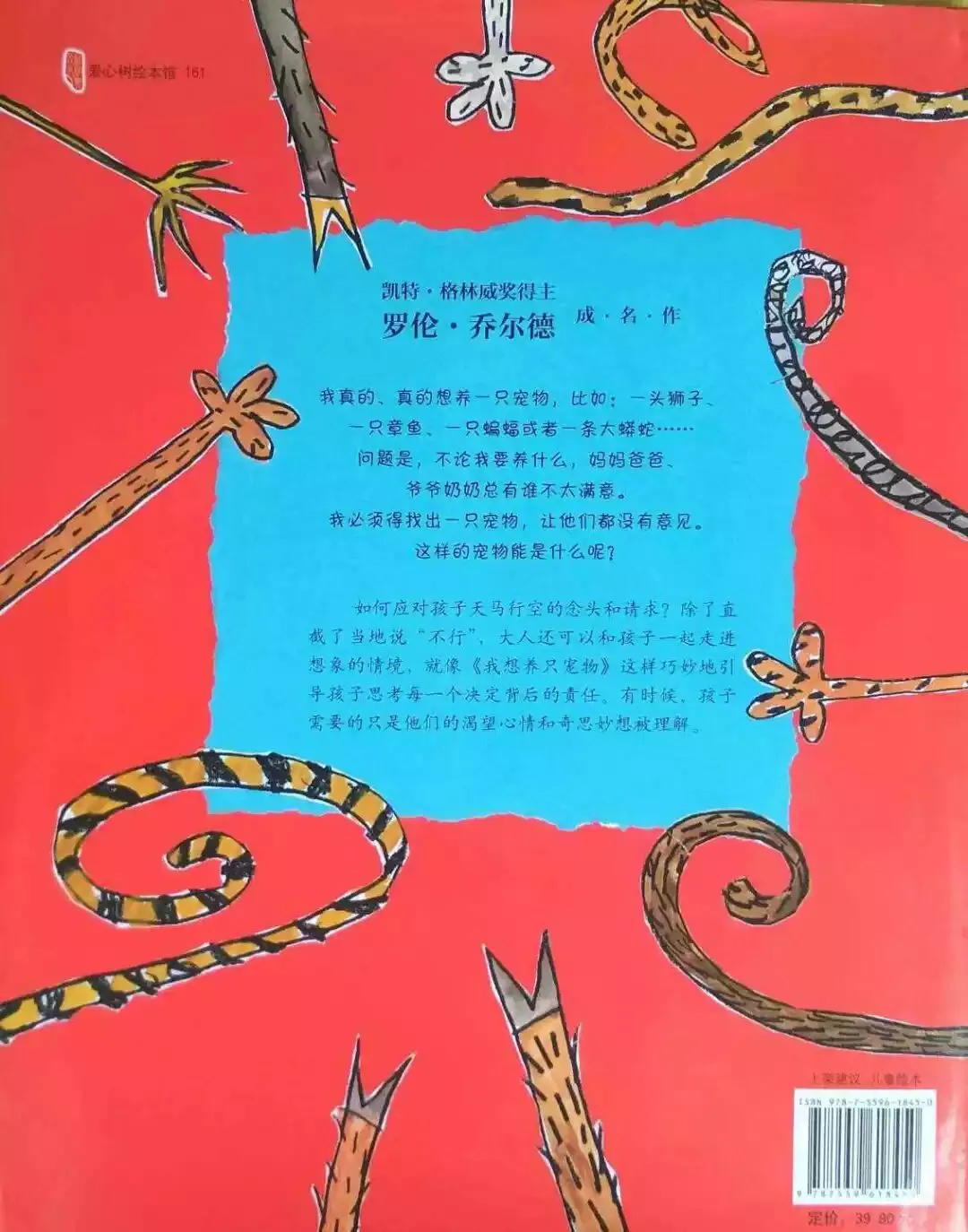 《我想养只宠物》是凯特·格林威奖得主罗伦·乔尔德进军童书界的处女作。她曾看到一位朋友站在宠物店的橱窗前,对着里面望眼欲穿,由此产生灵感创作了这部绘本。而她本人,则养过十六只豚鼠、两只仓鼠、两条金鱼、一只乌龟和上百只竹节虫!罗伦·乔尔德对儿童内心情感的捕捉细致入微,生动地表达出孩子对宠物的渴望。故事中千奇百怪的想法满足了孩子新奇的想象,幽默调皮的细节让不论是否想养宠物的人都能会心一笑。