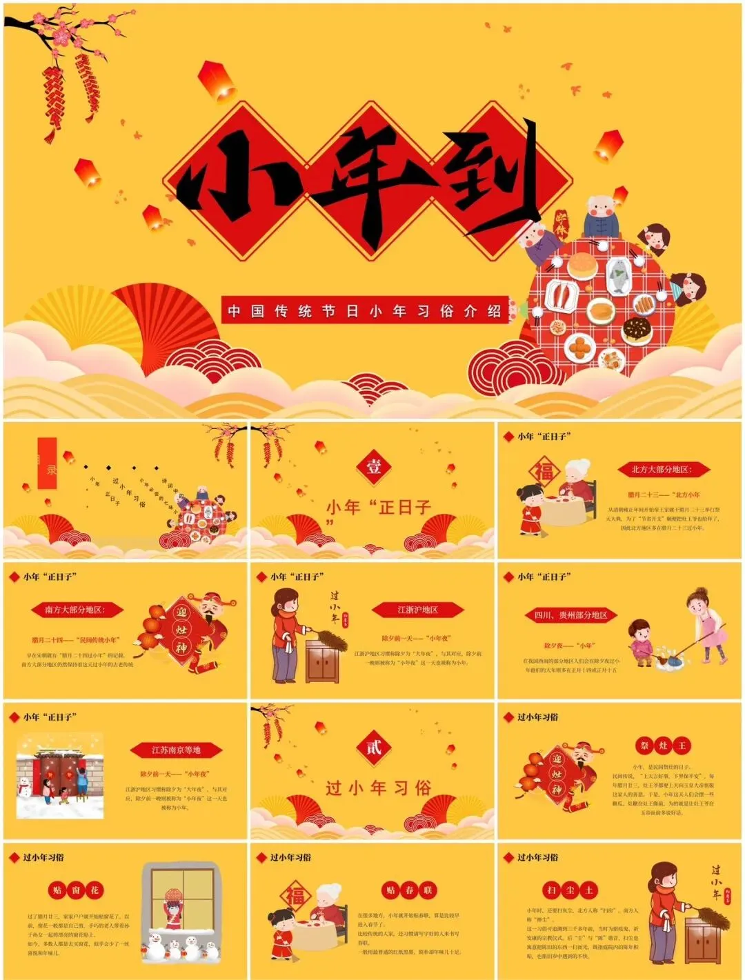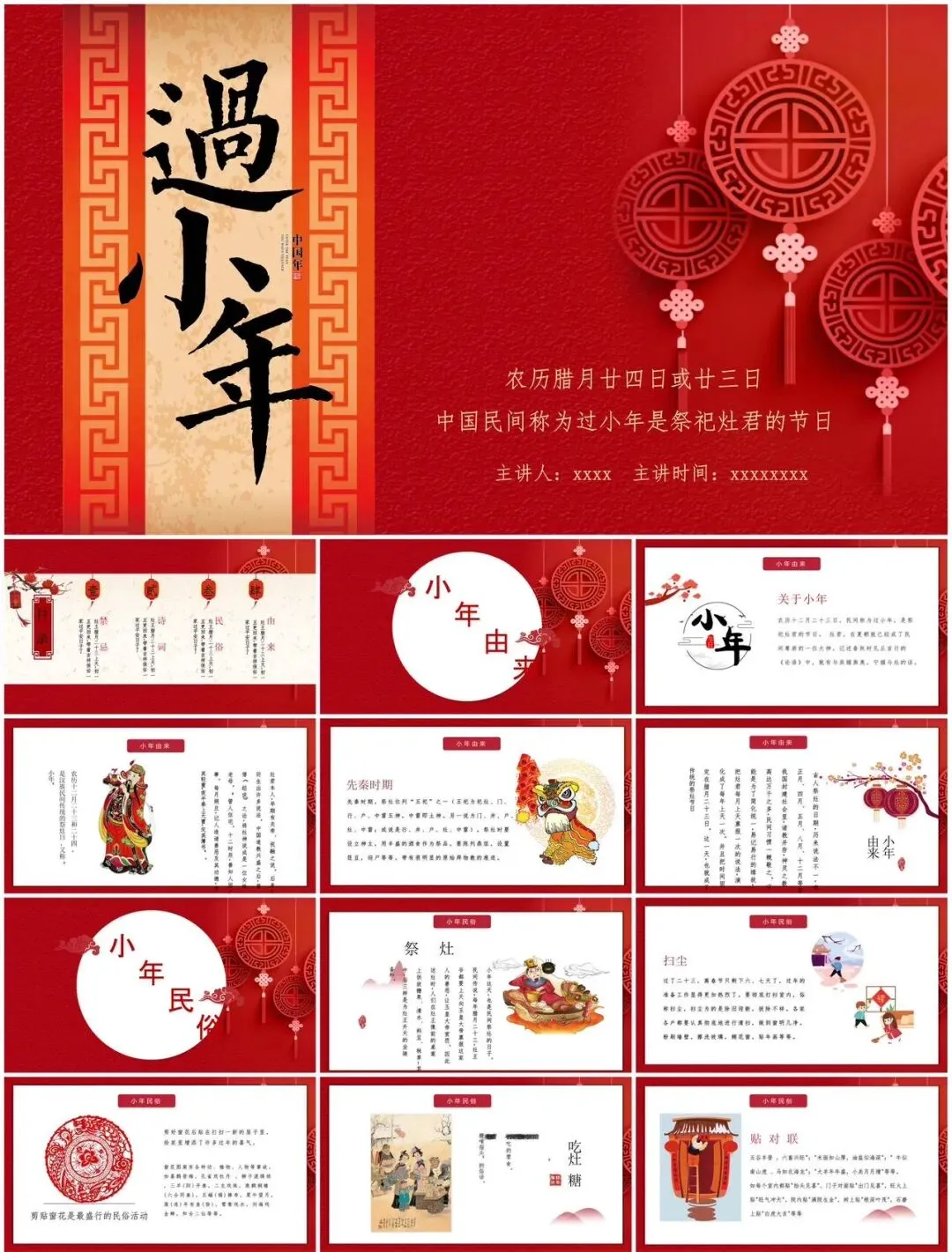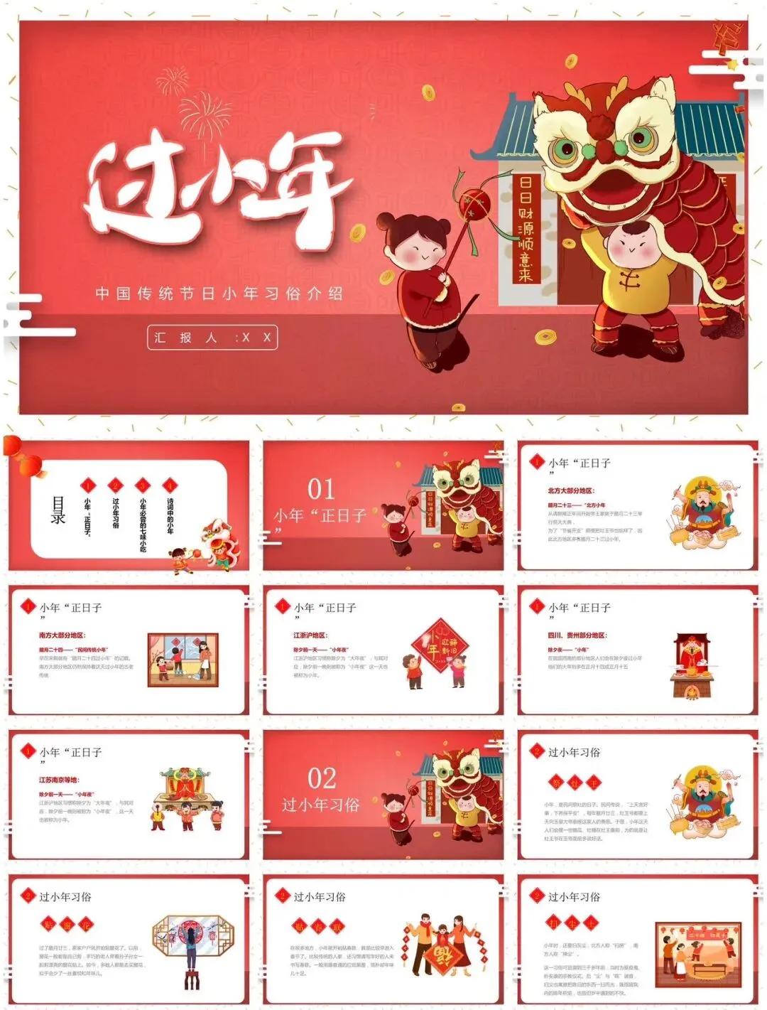 从动态灶王爷插画到"扫尘攻略"时间轴,从南北小年习俗PK页到麦芽糖转场特效——这套【限定款模板】以传统朱砂色为主调,融合剪纸艺术与可编辑的炊烟动效,让年终汇报充满仪式感。