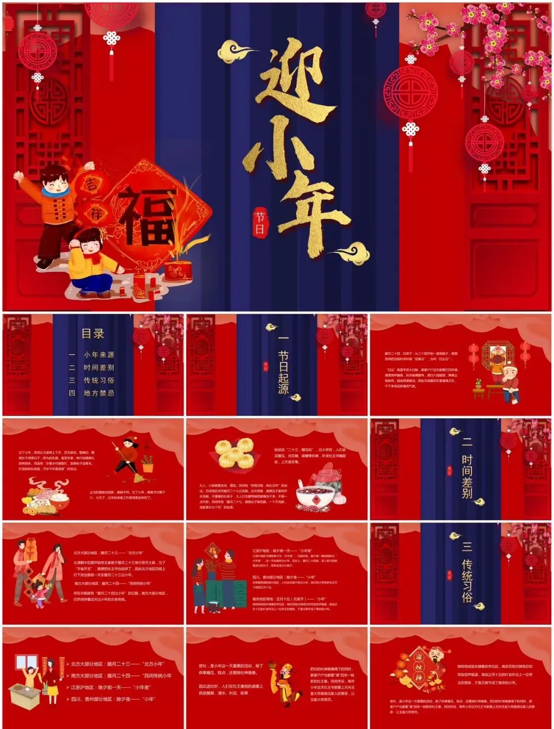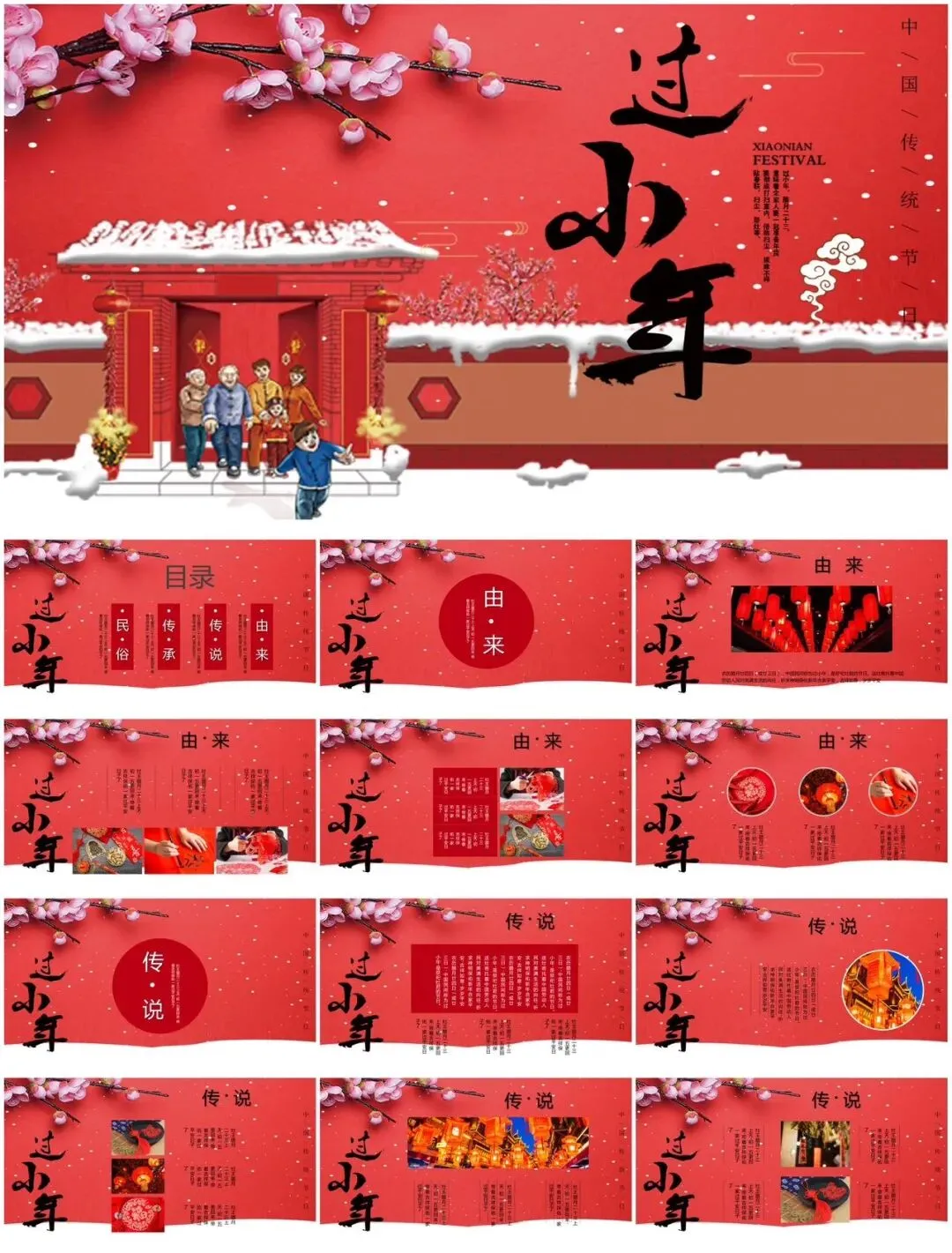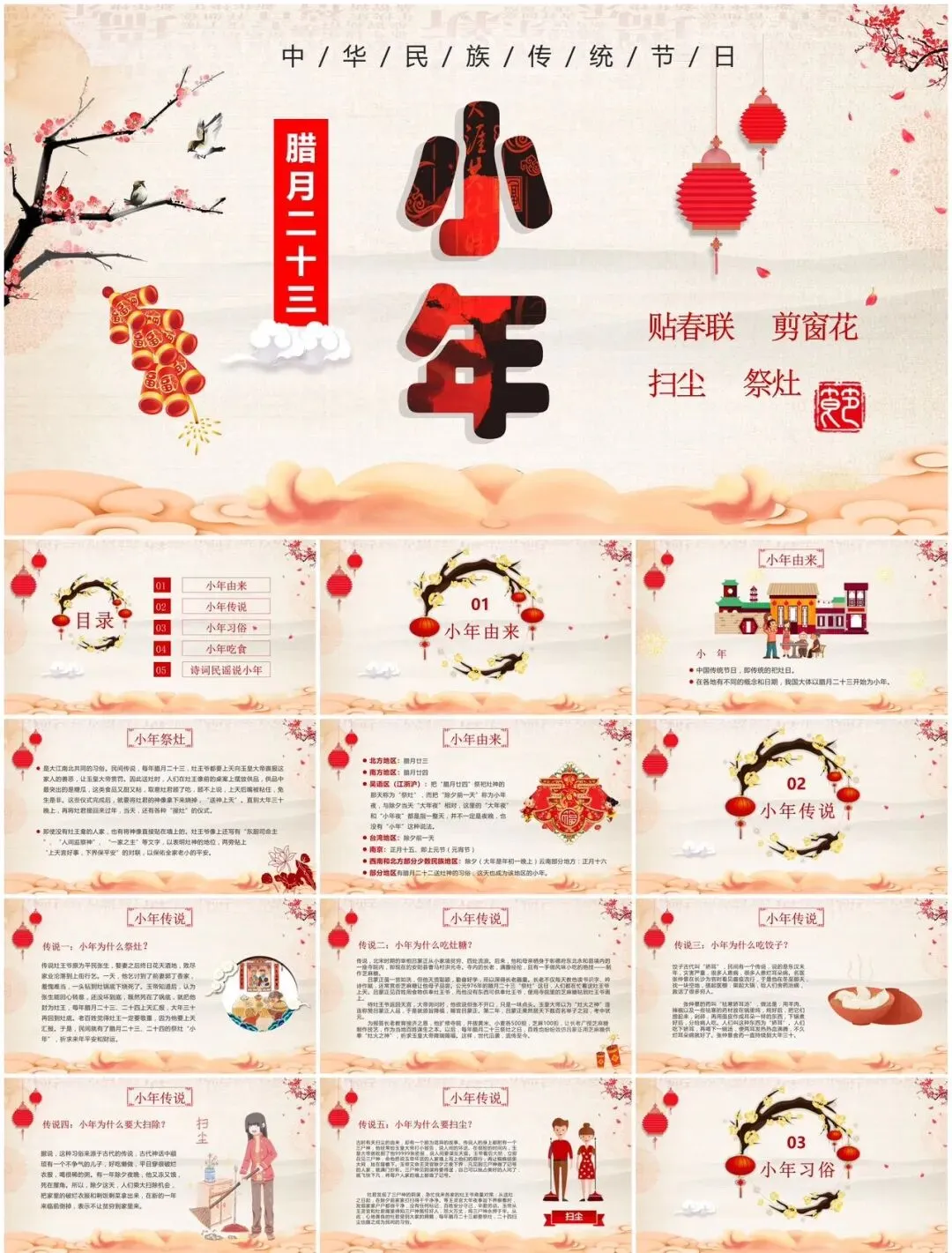 从动态灶王爷插画到"扫尘攻略"时间轴,从南北小年习俗PK页到麦芽糖转场特效——这套【限定款模板】以传统朱砂色为主调,融合剪纸艺术与可编辑的炊烟动效,让年终汇报充满仪式感。
