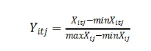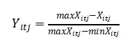 其中,i代表省份;t代表年份;j代表各项测量的指标;minXitj为j中的最小值;maxXitj为j中最大值;Yitj为处理后的结果。