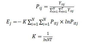 第二,计算标准化后各个指标的信息熵,即Ej。公式如下: