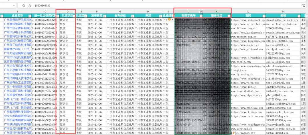 名录有33个字段:企业名称,登记状态,认定状态(首次或复审),认定级别,发布日期,法定代表人,注册资本,实缴资本,成立日期,统一社会信用代码,企业地址,所属省份,所属城市,所属区县,有效手机号,更多电话,邮箱,更多邮箱,参保人数,参保人数,所属年报,国标行业门类,国标行业大类,国标行业中类,国标行业小类,官网,通信地址,企业简介,经营范围,纳税人资质,最新年报营业收入,企查分,信用等级,科创分,科创等级,是否小微企业。