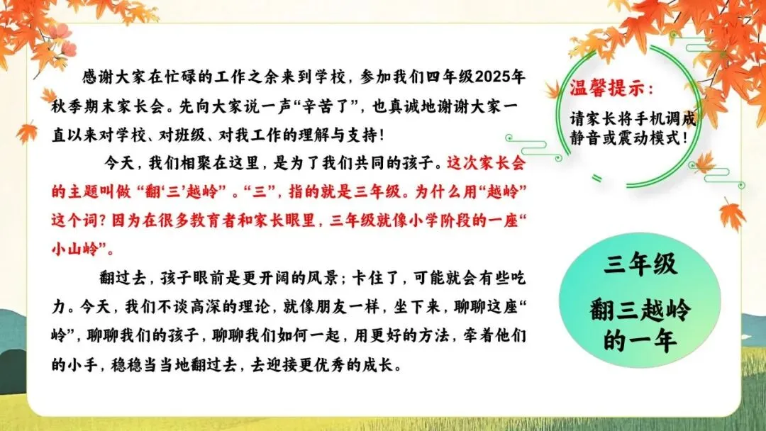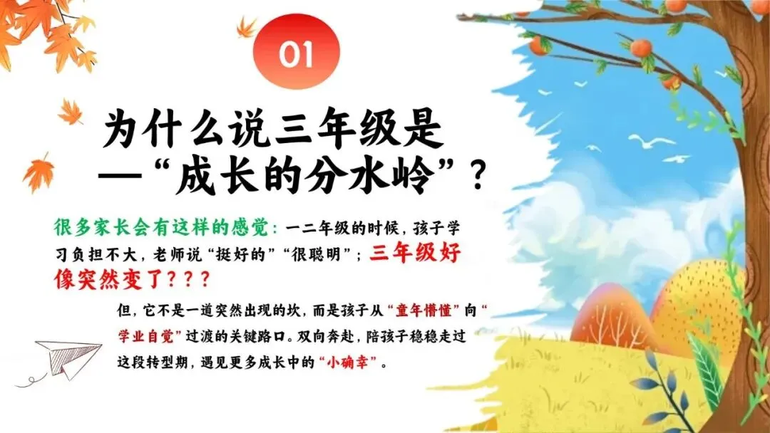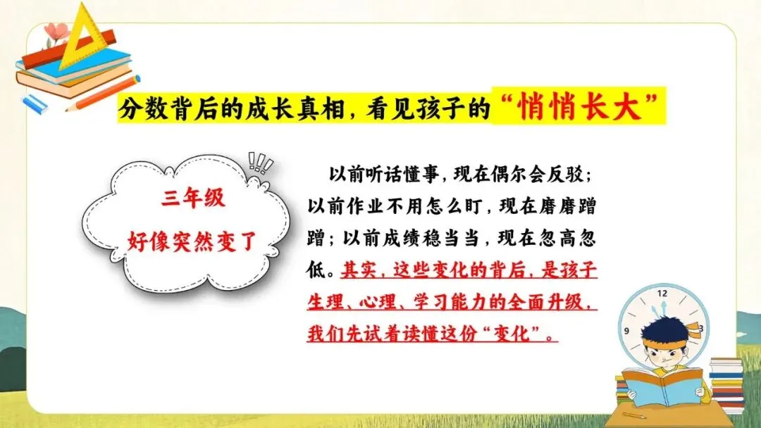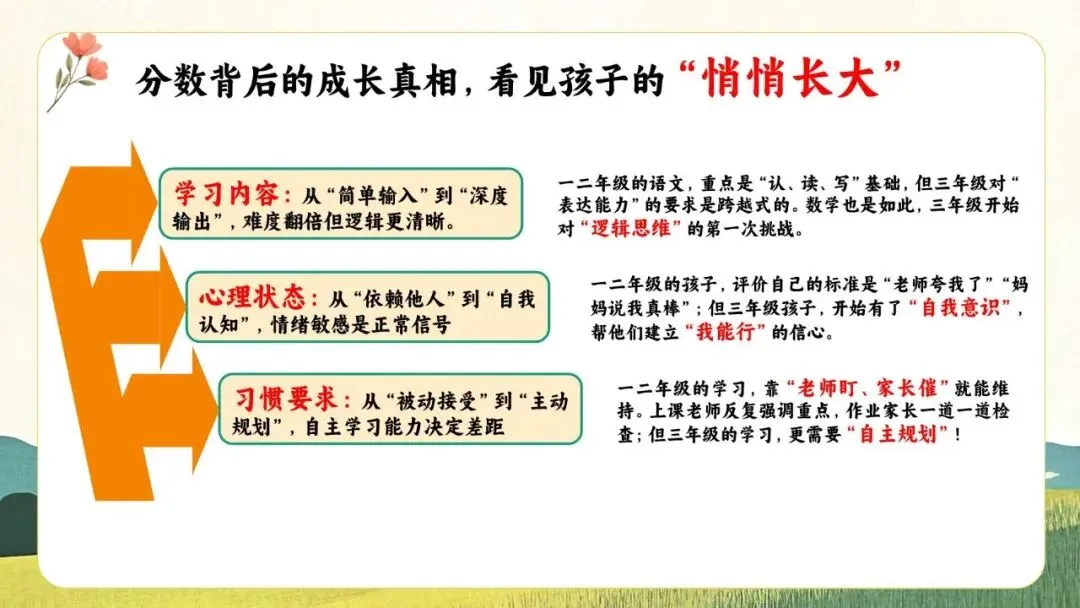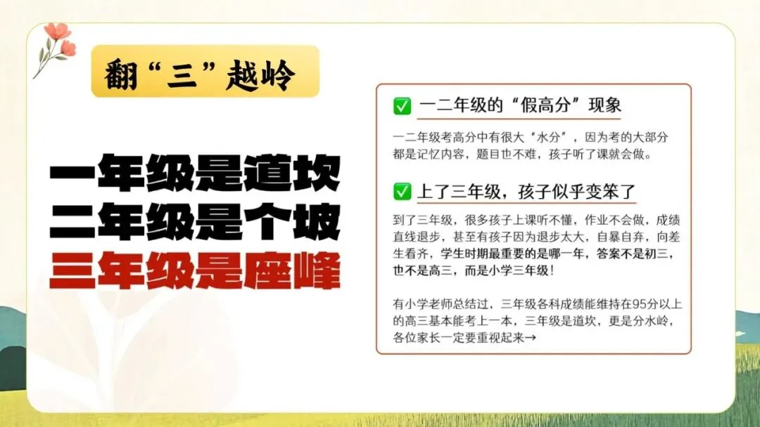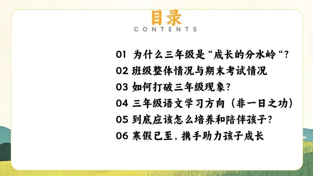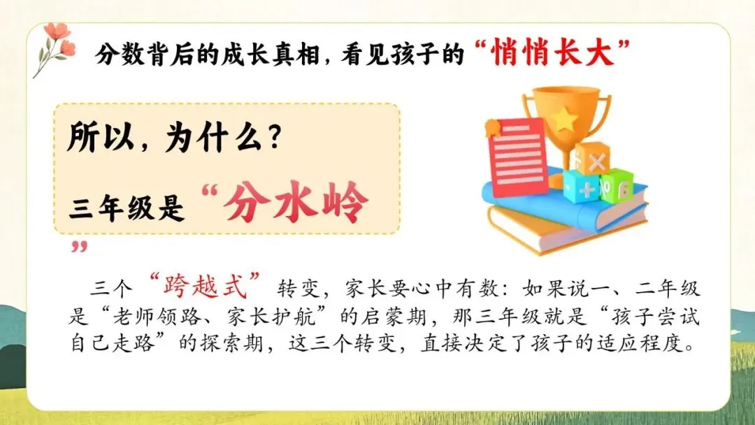 一份走心的三年级期末家长会PPT,帮你讲透“三年级现象”背后的成长逻辑。从分水岭解析到习惯养成,从语文学习到寒假规划,内容扎实、策略落地,适合教师直接使用或借鉴。不只面向家长,更是教师开展家校沟通、把握关键学段的实用资源。走进真实教育现场,助力每一个孩子稳稳“翻山越岭”。