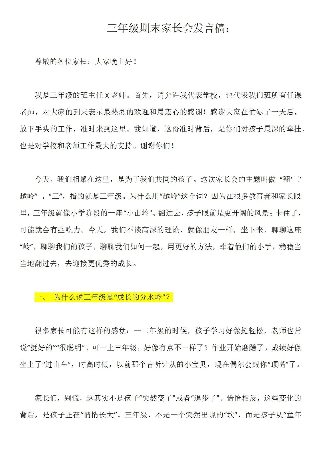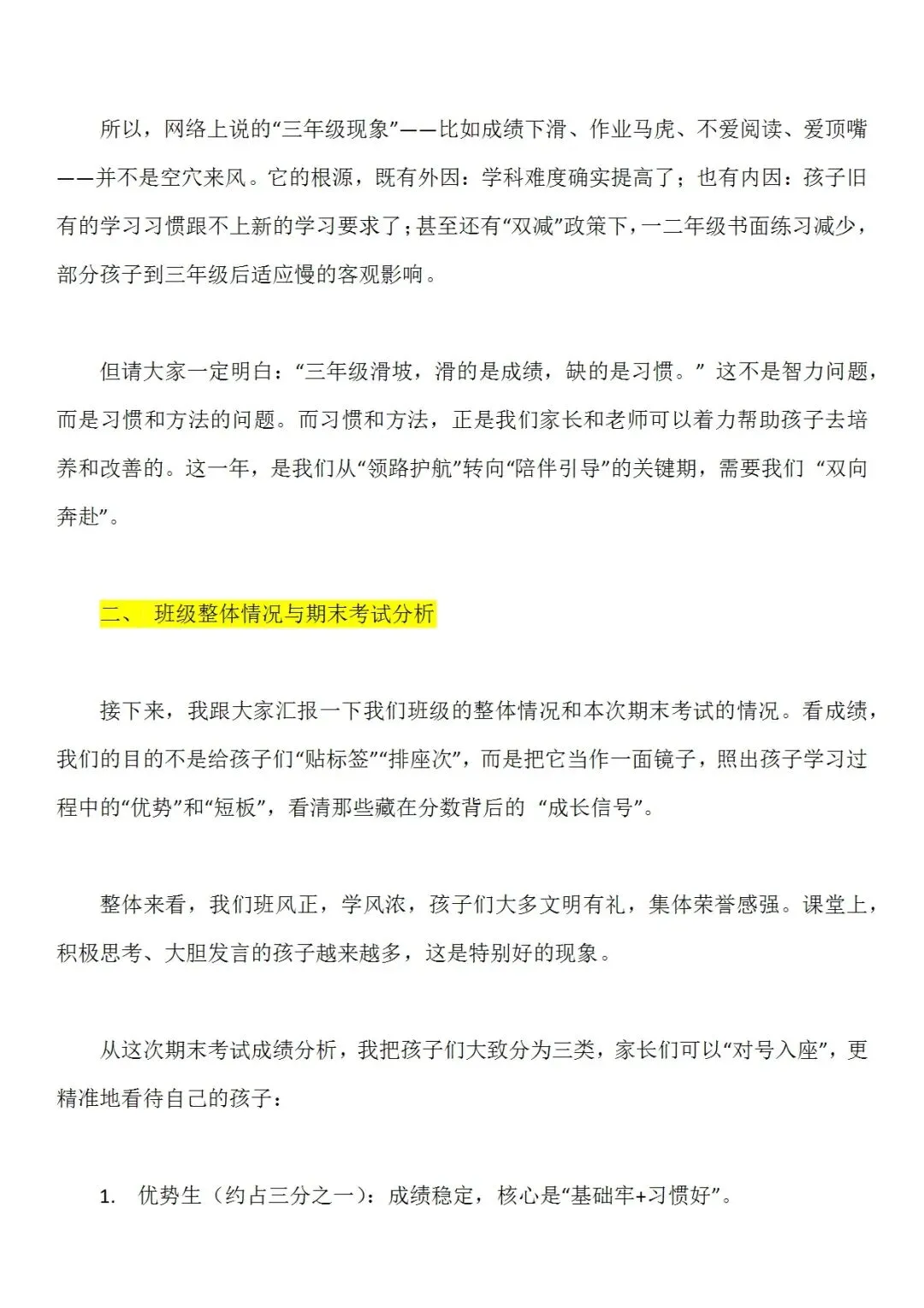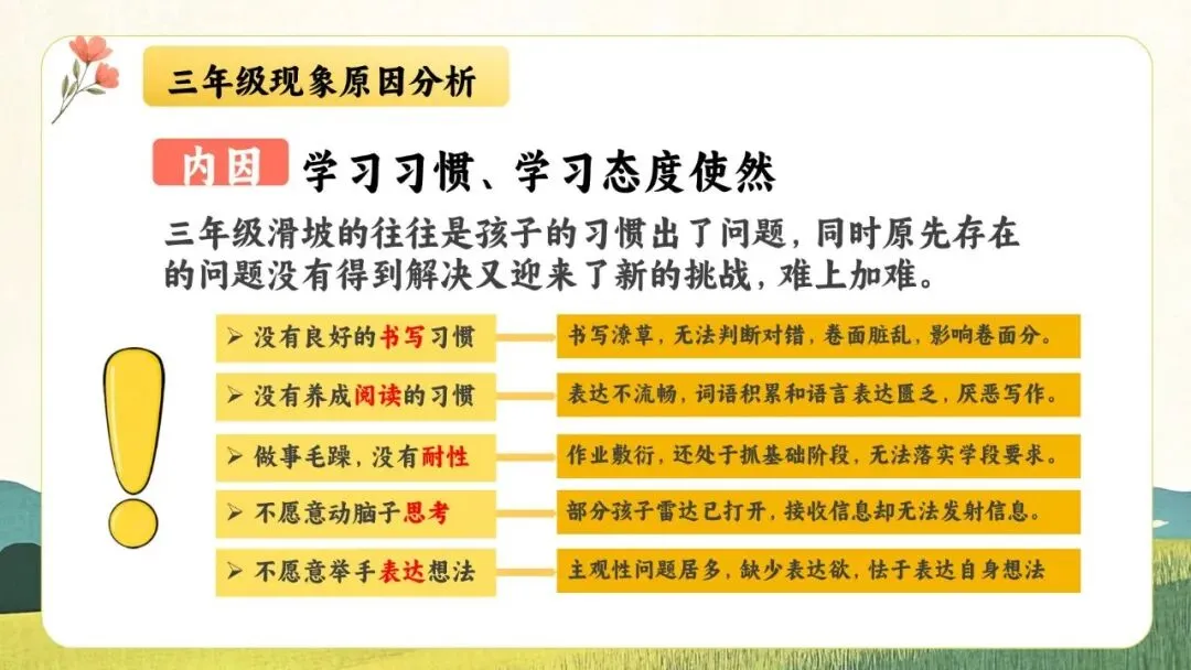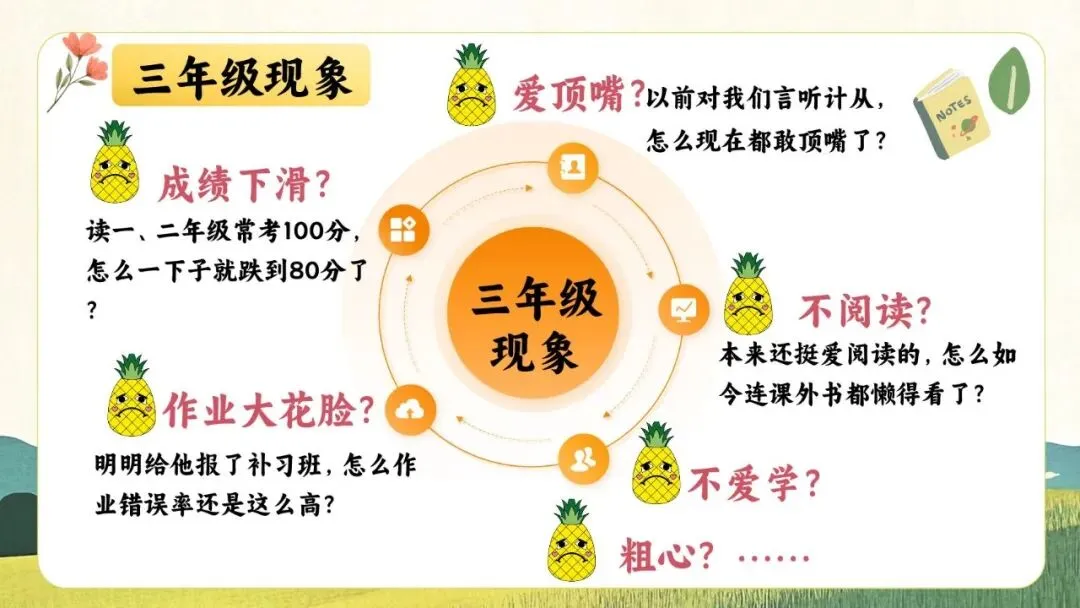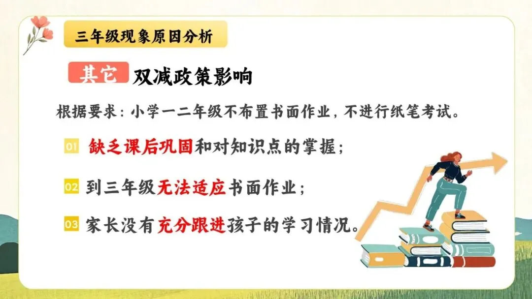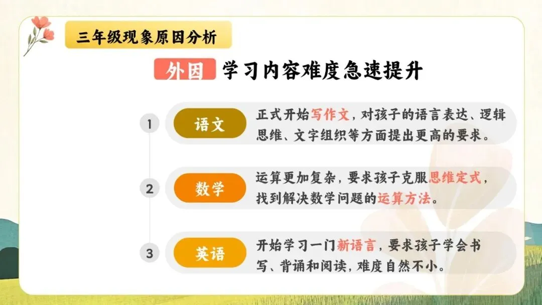 一份走心的三年级期末家长会PPT,帮你讲透“三年级现象”背后的成长逻辑。从分水岭解析到习惯养成,从语文学习到寒假规划,内容扎实、策略落地,适合教师直接使用或借鉴。不只面向家长,更是教师开展家校沟通、把握关键学段的实用资源。走进真实教育现场,助力每一个孩子稳稳“翻山越岭”。