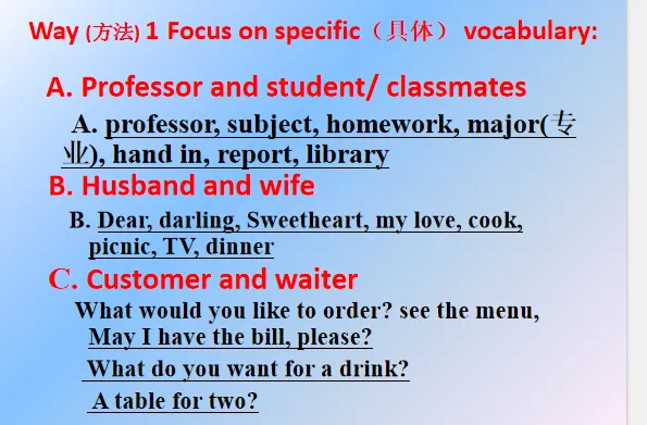 2. 语境理解能力:能根据语音语调、上下文推断陌生词汇含义,区分特殊语气的真实意图。
