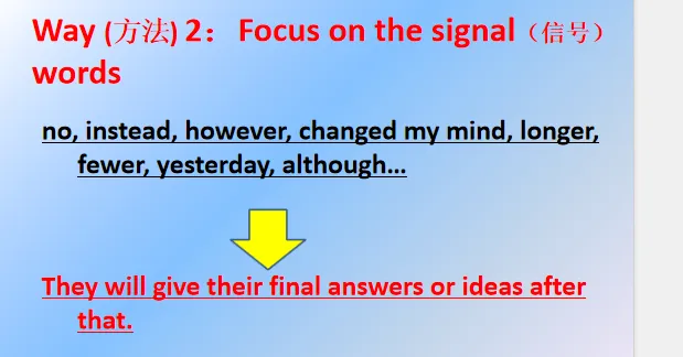 3. 逻辑分析能力:梳理听力材料里的因果、转折、对比等逻辑关系,判断说话人的态度、观点或后续行为倾向。