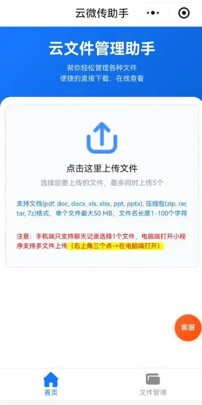 公众号不能上传附件,应该让很多平台管理者都很头疼的事,各种报名表、通知文件都是Word、Excel、PPT等文件,真的不知道该怎么办?近期发现了一个小工具,云微传助手非常好用,而且是免费的哦!云微传助手是一款专为公众号运营者设计的小程序,核心功能就是让你能在公众号文章中直接插入可下载的附件。操作简单,完全免费,支持50MB以内的文件上传,读者无需跳转即可直接下载或在线查看。电脑:可以在上传微信聊天记录文件的同时,还可以上传电脑里编辑好的文档,非常方便。云微传助手的主要特点: