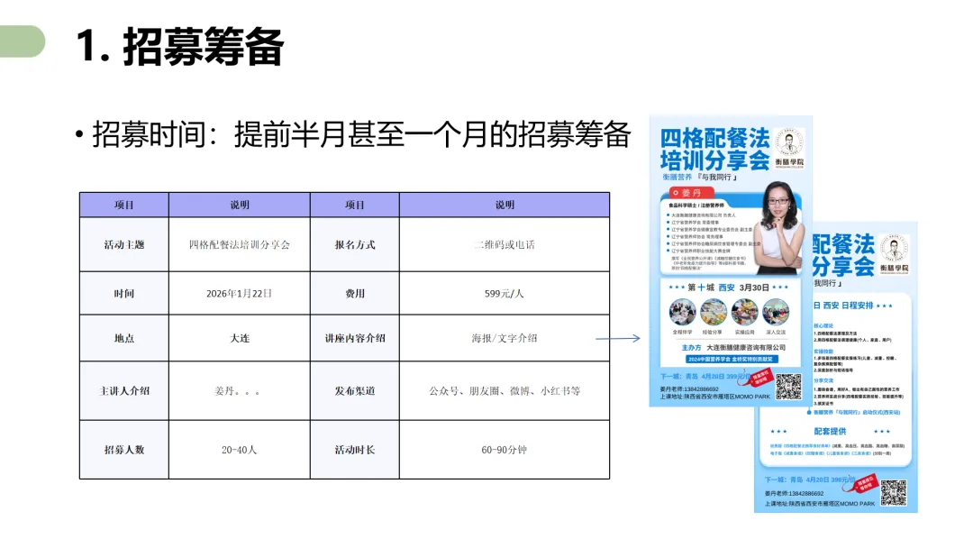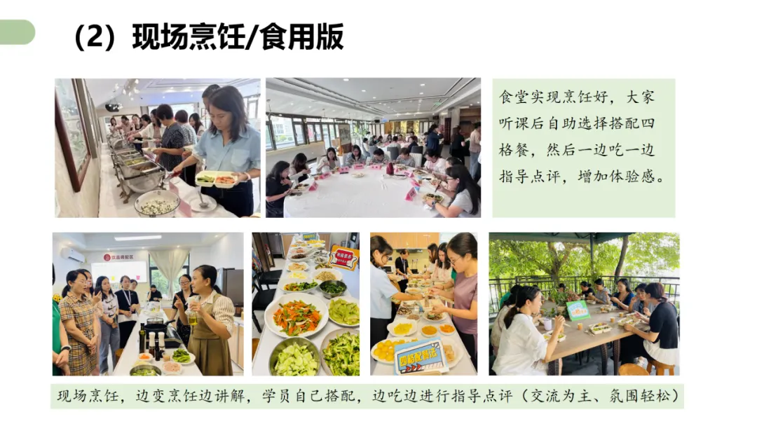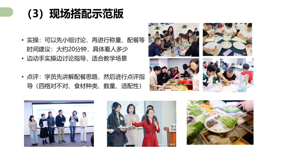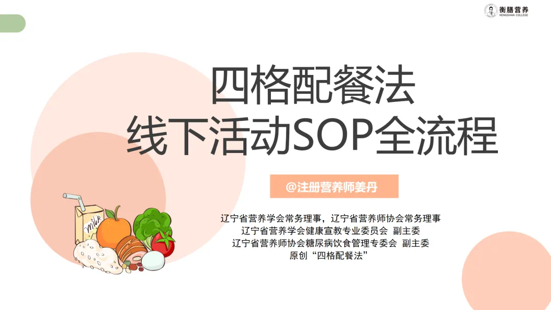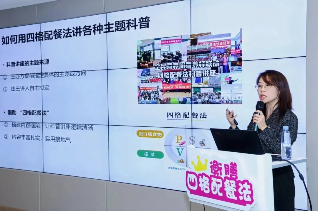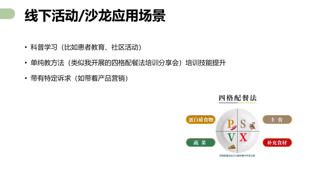 注册营养师姜丹主讲了四个核心课程,包括《四格配餐法在营养科普讲座中的应用》《四格配餐法线下活动SOP全流程》《四格配餐法促进营养品销售》和《四格配餐法用于营养服务》。她从自己的工作经验出发,也结合衡膳营养师团队的实践案例,详实、细致、手把手地讲解了如何用四格配餐法做好营养科普讲座、线下活动、营养类产品销售和营养服务。她不但认真梳理了这些工作的流程和要点,还提供了不少工具、图片、清单、方案、表格和课件,而且都免费提供给所有参加培训的学员们。
