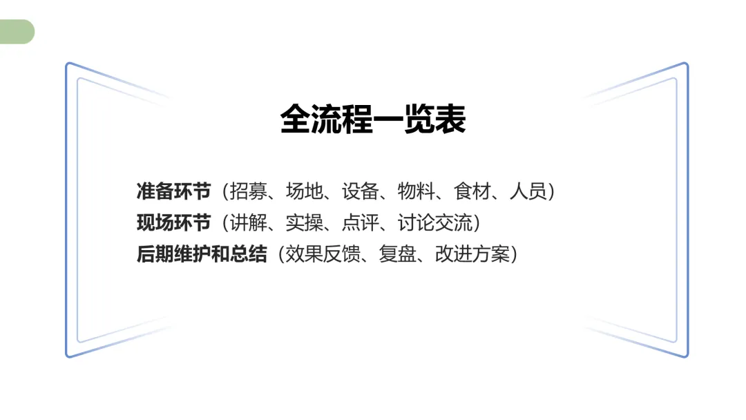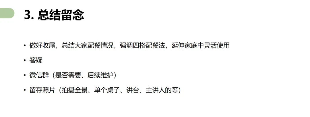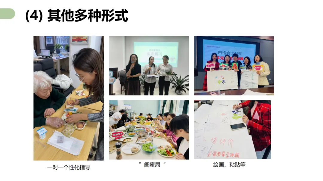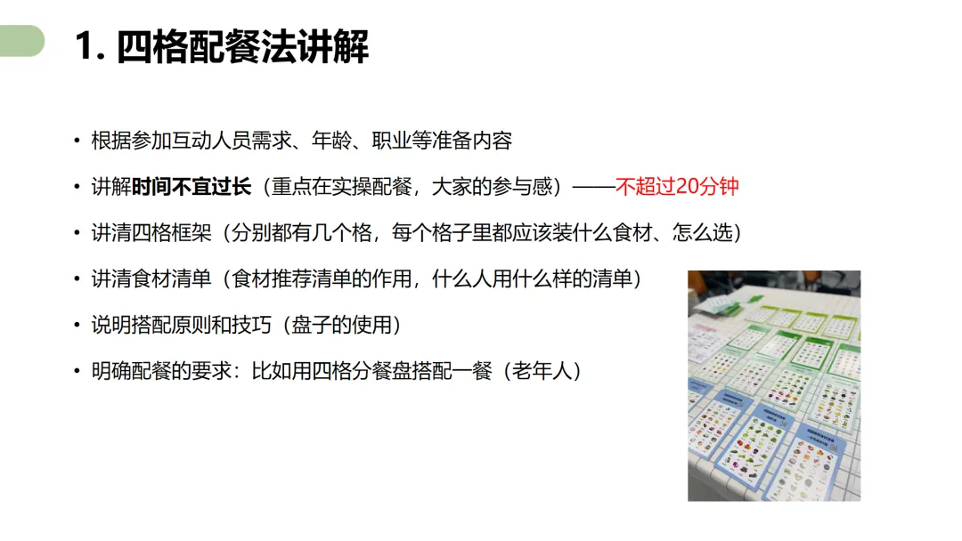培训内容围绕“四格配餐法”多场景应用展开,从科普讲座、线下活动、营养服务、营养类产品销售等多个角度拆解四格配餐法应用的SOP。进一步将四格配餐法深化为一套硬核的、可传授的、可商业化应用的技术体系。