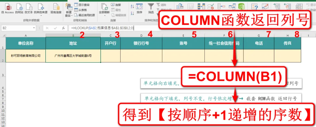 第一个信息是地址,在查找范围的第2行,需要输入数字2,此时利用函数返回的第1个列号是B,也就是第2列,因此可以利用公式=COLUMN(B1),返回数字2,向下填充时,就可以得到按顺序+1递增的序数,得到2、3、4...的序列,如下图: 温馨提示:利用COLUMN函数返回列号,这里可以利用公式=COLUMN(B1),也可以使用=COLUMN(B2),=COLUMN(B3),这里只会返回列号,与行号无关哦~