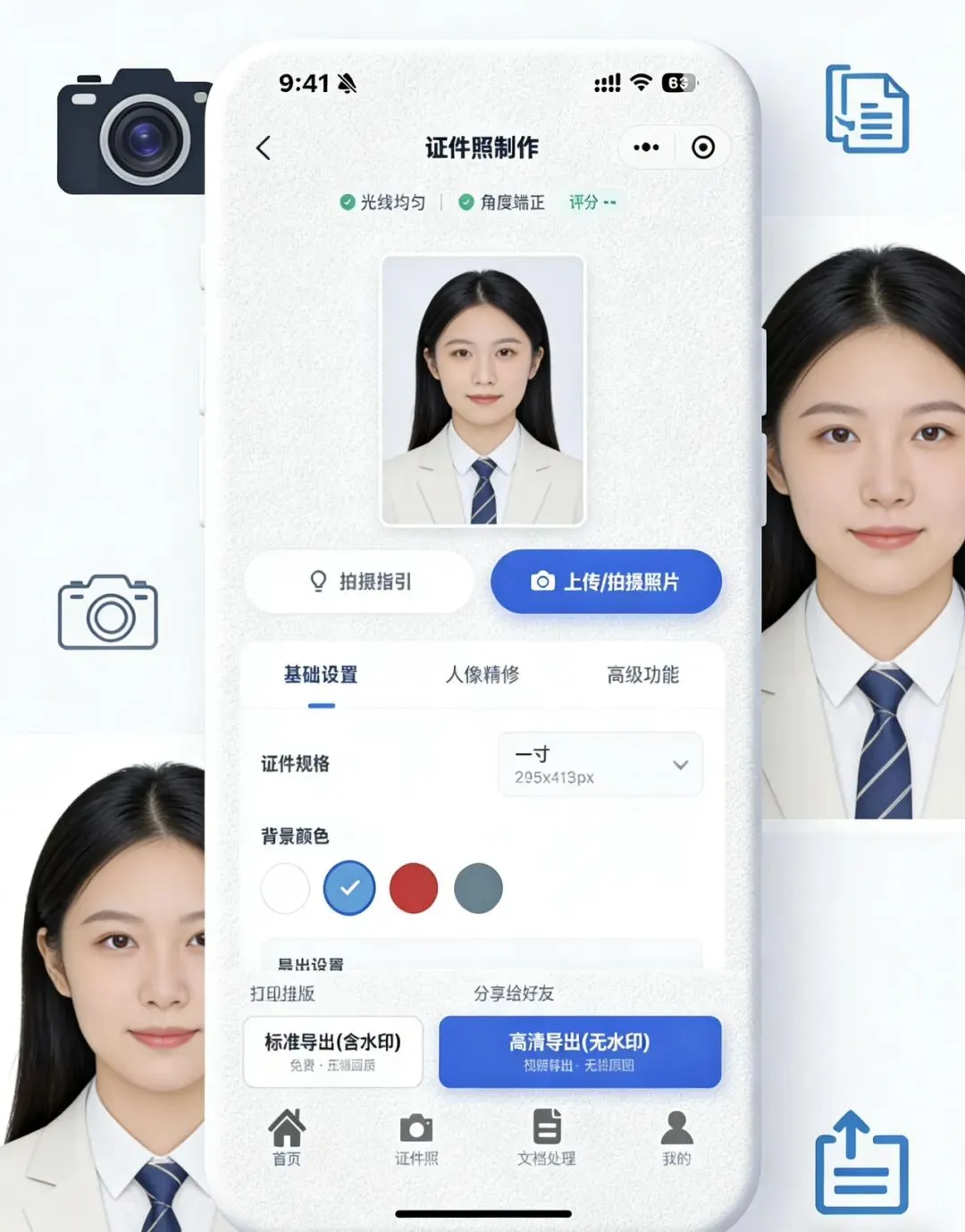 覆盖一寸/二寸/签证照/社保照等全常用尺寸,红底/白底/蓝底一键切换,智能抠图、美颜优化一步到位,在家随手拍,即刻出符合规范的高清证件照,不用再跑照相馆、花时间等片。
