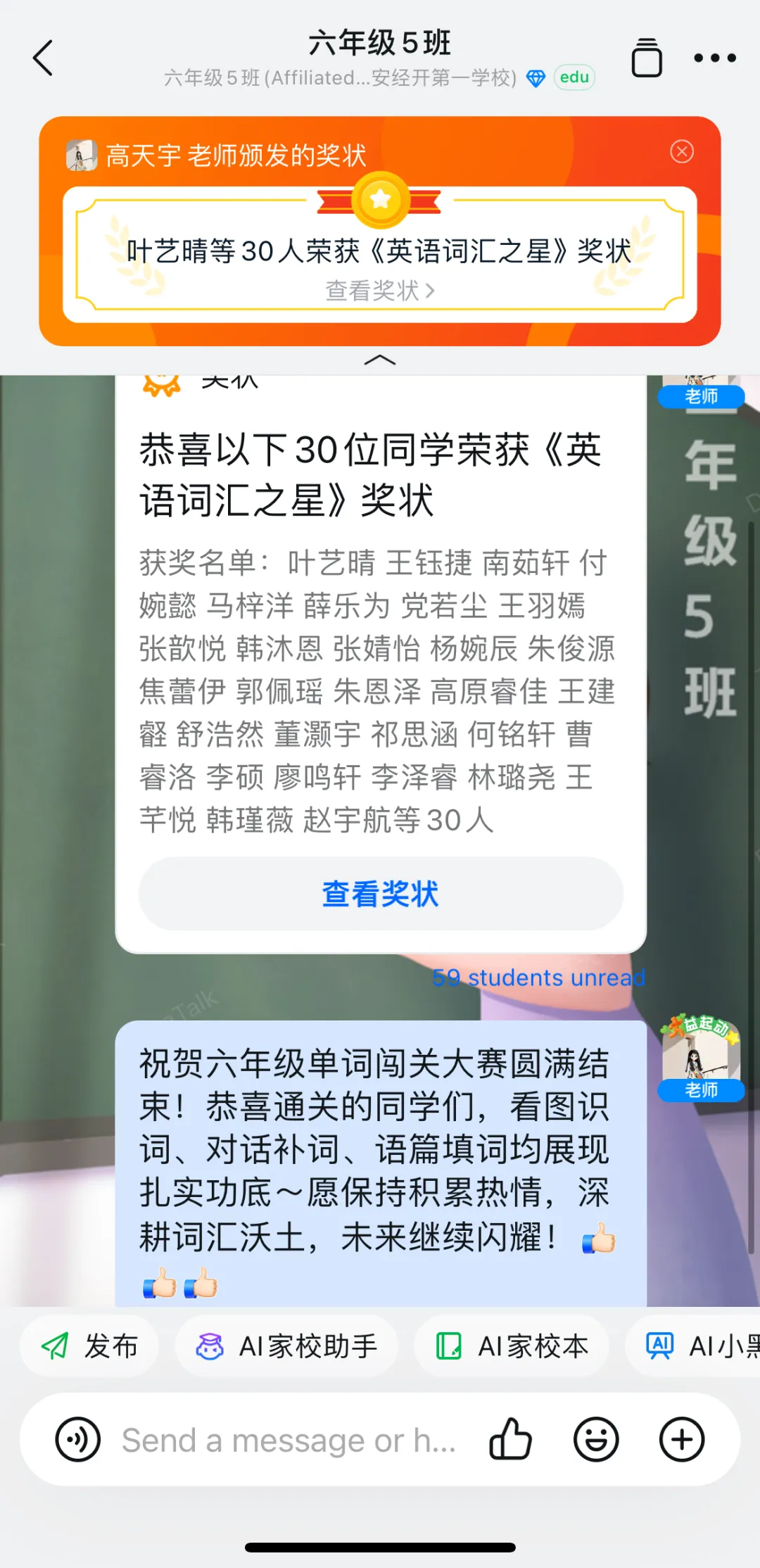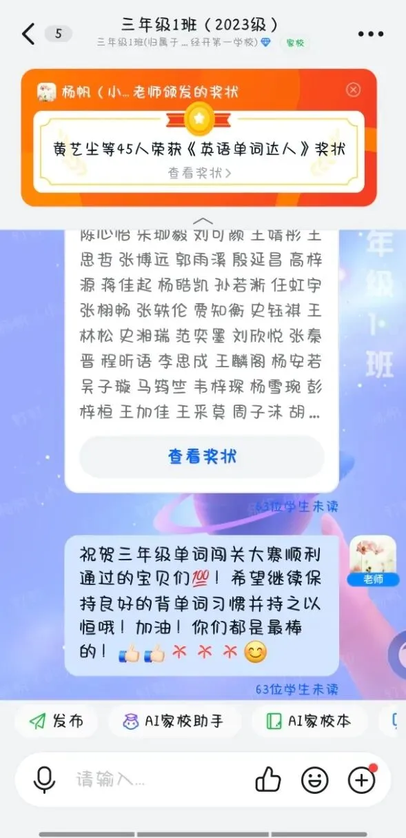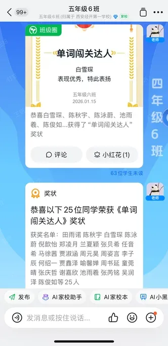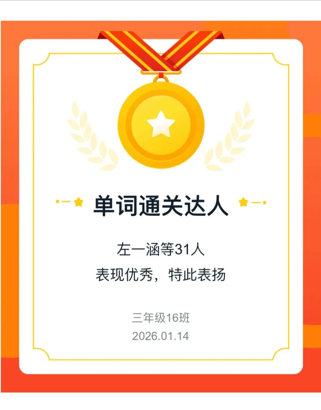 最令人期待的时刻终于到来——当那一张张电子奖状轻盈地跃进班级群,整个屏幕仿佛都被喜悦点亮!“单词闯关小达人”的称号在证书上闪闪发光,像一颗颗被点亮的星星,照亮了每一个认真闯关的名字。
