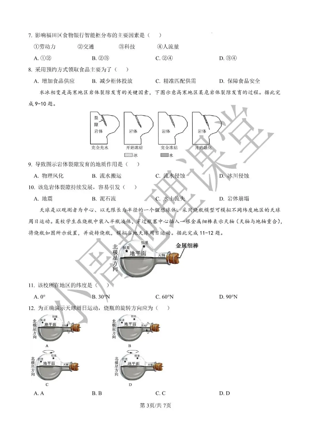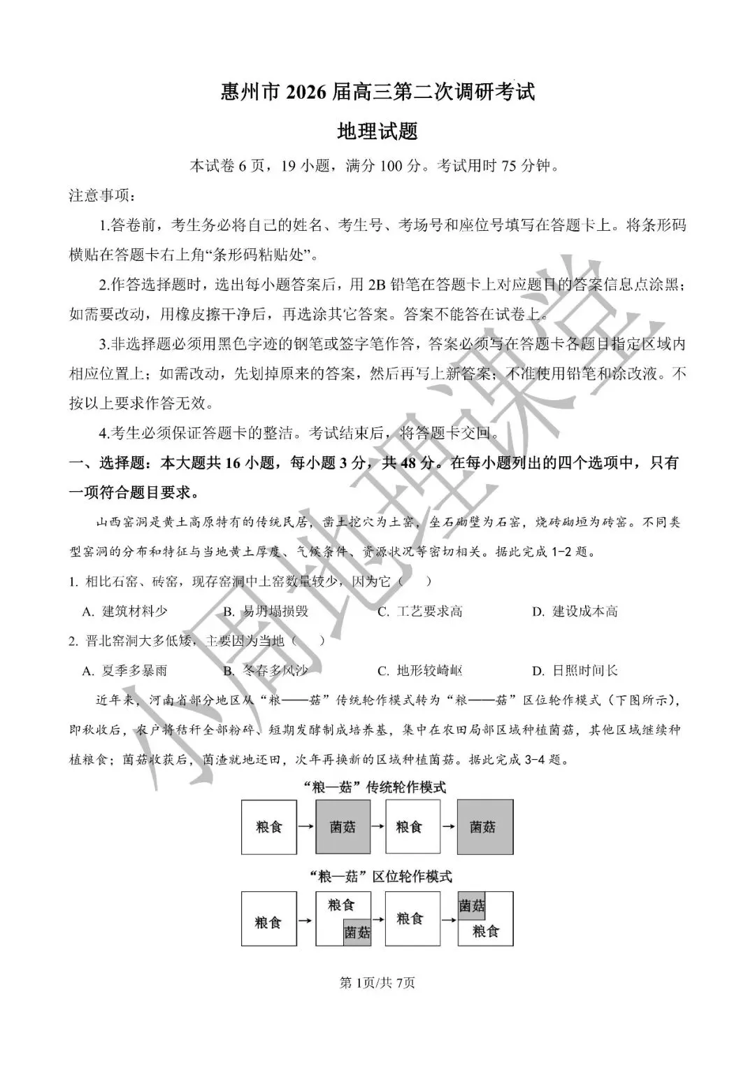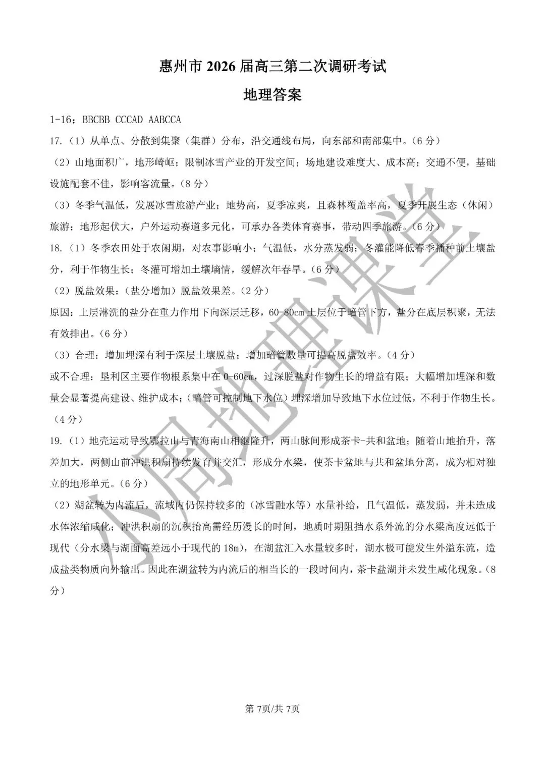 >惠州市2026届高三二调地理试题word高清版(含答案)