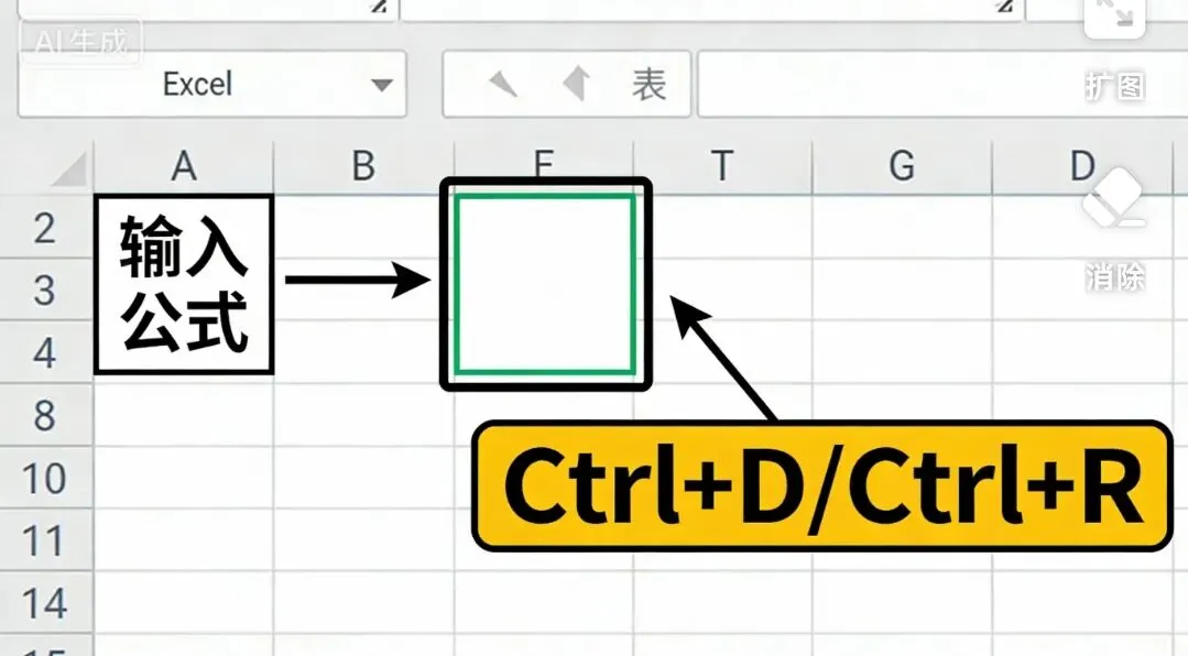 操作技巧:输入第一个公式后,选中公式单元格和需要填充的空白区域,按「Ctrl+D」(向下填充)/「Ctrl+R」(向右填充),一秒完成所有公式填充,精准又高效。