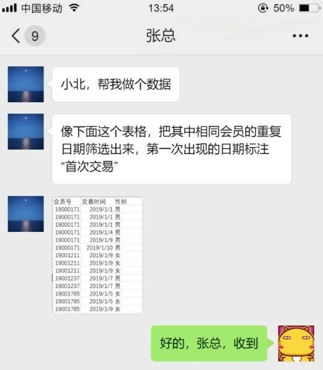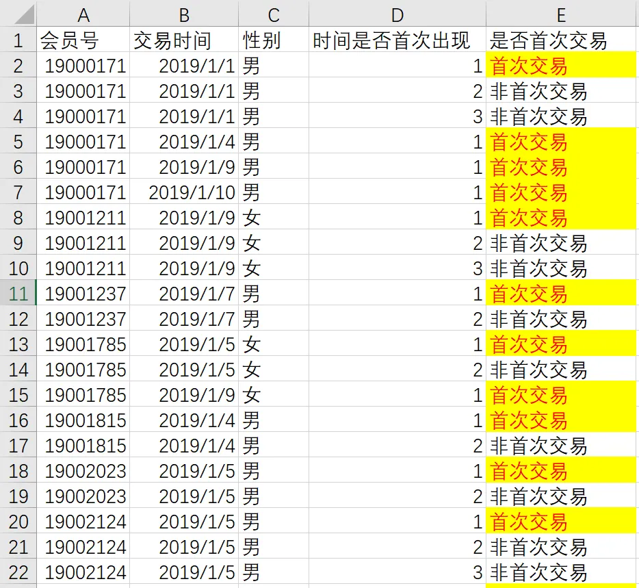 上周日我正悠哉悠哉地在网上冲浪,突然老板发来一个表格,让我把其中相同会员的重复交易日期筛选出来,第一次出现的日期标注为「首次交易」。啊啊啊啊啊啊!!为什么周末还要工作啊!!