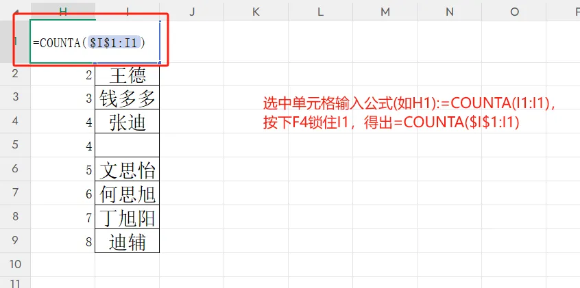 2️⃣输入专属公式:=COUNTA(I1:I1)(重点技巧!选中公式里的“I1”后按F4键,可一键锁住I1生成绝对引用$I$1,得出=COUNTA($I$1:I1),无需手动输入符号哈;I列是内容列,后续调整可直接替换“I”,比如J列就改成$J$1:J1);