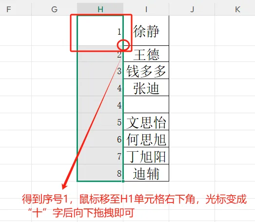 3️⃣批量填充序号:按下回车得到第一个序号“1”,选中H1单元格,鼠标放在右下角变成黑色十字(填充柄),向下拖拽,序号会自动跳过I列空白行(含I5),连续生成!