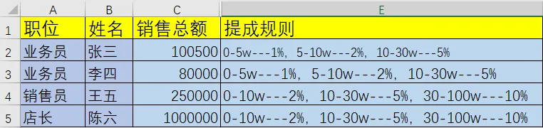 根据上表中C列的销售总额,结合每行E列提成规则进行计算