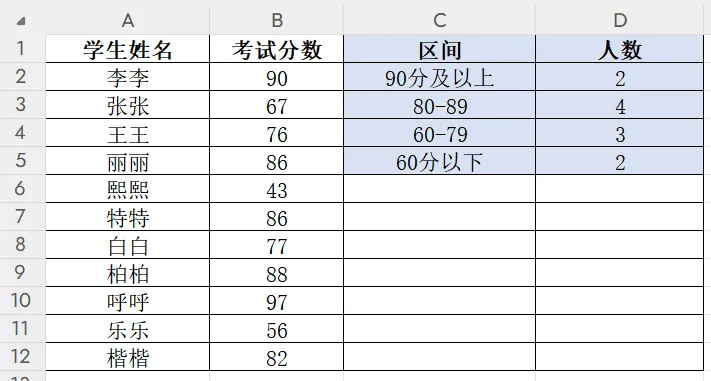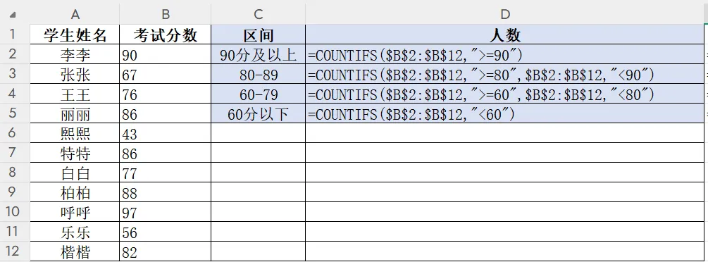 ③ D4输入:=COUNTIFS($B$2:$B$12,">=60",$B$2:$B$12,"<80")